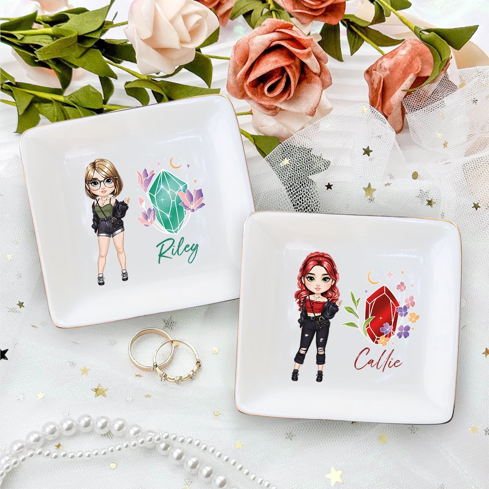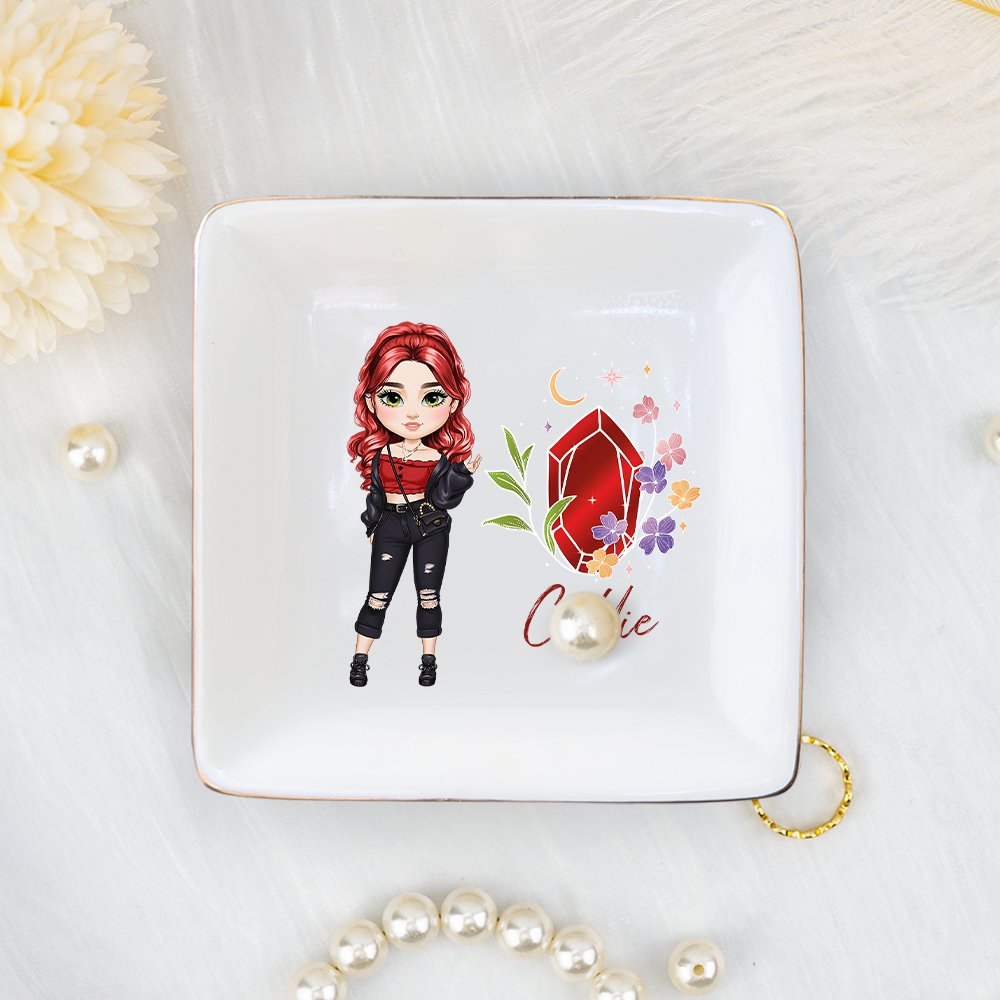 Das Design dieser Schmuckschale ist einzigartig, und die Schmuckschale ist sorgfältig mit verschiedenen Arten von modischen Mädchen Clip-Art gedruckt. Die Verwendung von Geburtssteinmustern, durchsetzt mit Mond, Sternen und bunten Blumen, macht das ganze Design geheimnisvoller und romantischer. Die Schmuckschale kann auch mit einem Namen bedruckt werden, was sie zu einem einzigartigen Kunstwerk macht.