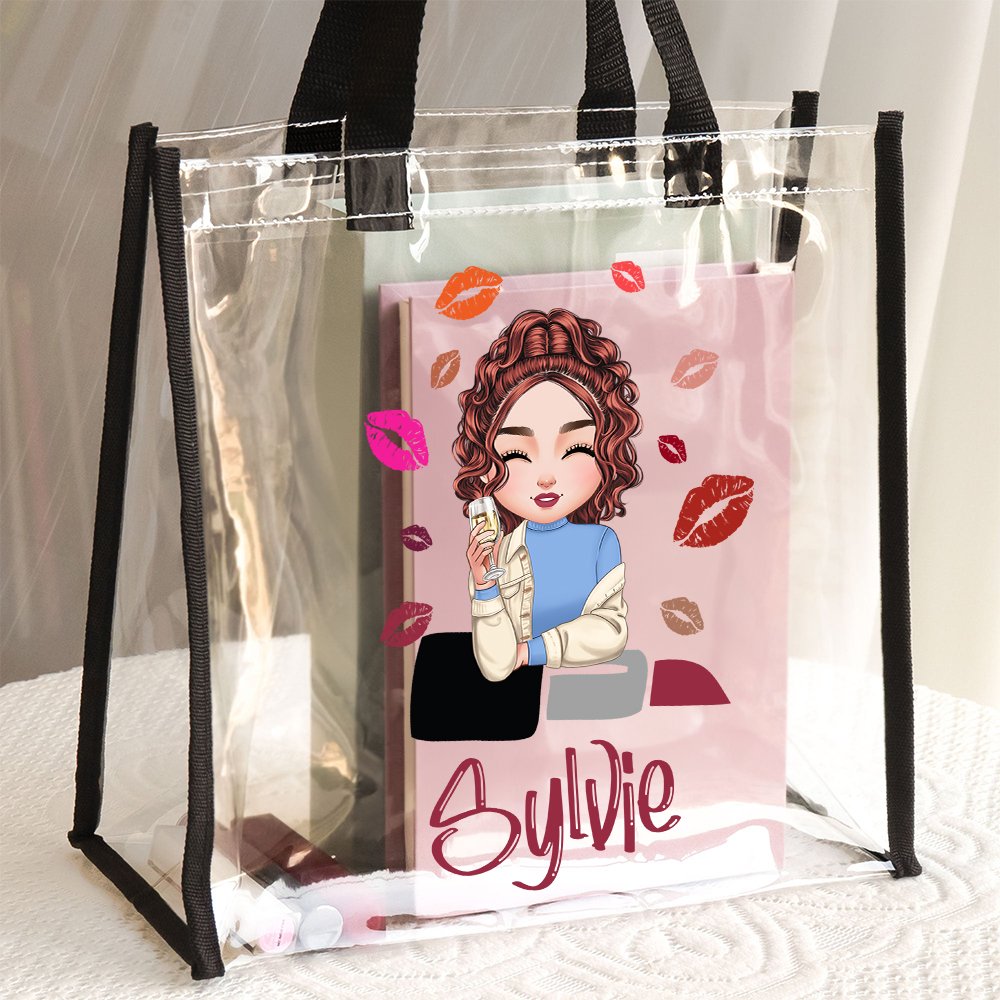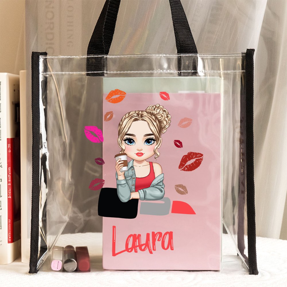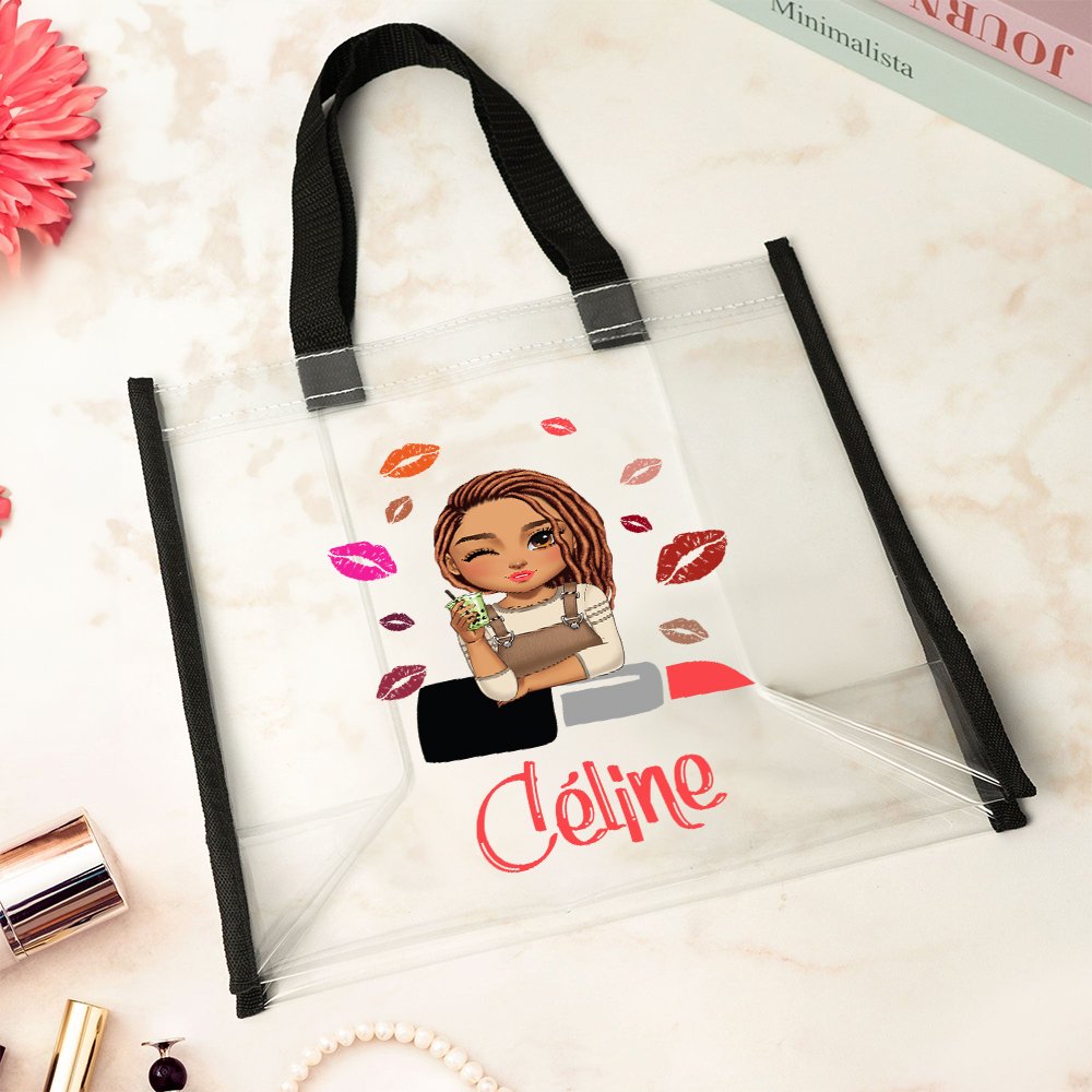Diese Tasche ist mit einem niedlichen Cartoon-Modell eines Mode-Mädchens bedruckt, umgeben von verschiedenen Lippenstift-Mustern, die eine fröhliche und lebendige Atmosphäre schaffen. Sie können auch Ihren Namen auf der Tasche anpassen, wodurch jede Tragetasche einzigartig wird und Ihren Stil perfekt widerspiegelt.