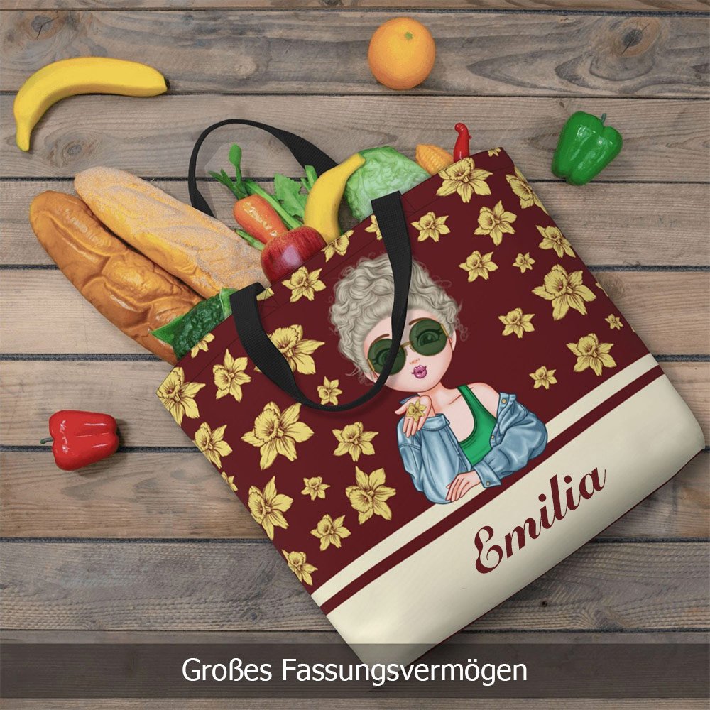 Diese Tragetasche kombiniert geschickt Cartoon-Mädchenbilder mit Geburtsblumenelementen, um ein einzigartiges Design zu schaffen. Die Tasche ist mehrdimensional anpassbar: Sie können Hintergrundfarben (wie Schwarz, Rosa, Marineblau usw.) wählen, die Details des Charakters anpassen, exklusive Geburtsblumen zusammenstellen und Ihren Namen hinzufügen.