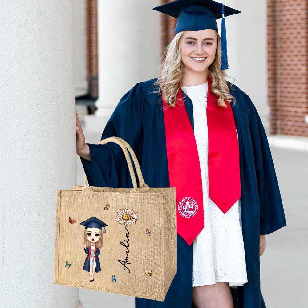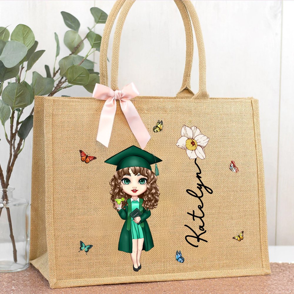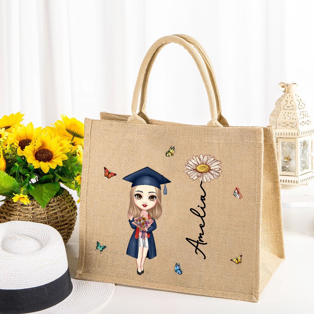 Diese Tasche ist mit einem niedlichen Cartoon-Absolventen gestaltet und wird mit einer Geburtsblume und dem Namen versehen. Es gibt vier Modelle zur Auswahl, darunter normale große und kleine Taschen sowie große Taschen mit Magnetschnalle und Reißverschluss. Es ist ein einzigartiges und sinnvolles Accessoire, das Ihre Persönlichkeit zeigt.