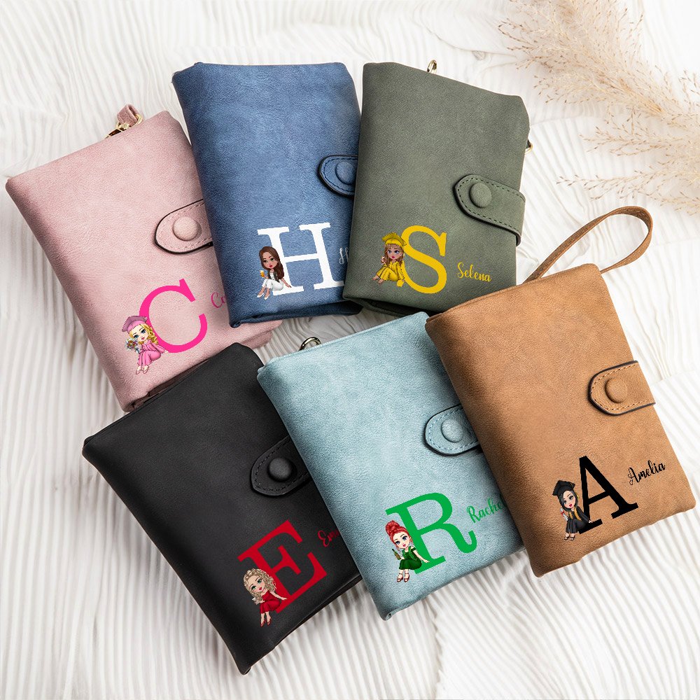 Dieses Portemonnaie kombiniert Stil und Funktionalität. Sie ist mit einem trendigen Cartoon-Mädchen gestaltet, das einen Abschlusshut und ein Kleidungsstück trägt, und hat einen individuellen Namen, um ein einzigartiges, praktisches Andenken für jedes Mädchen mit Abschluss zu schaffen.