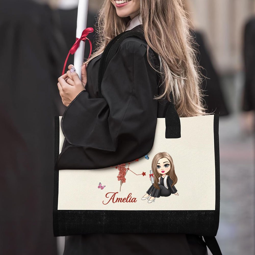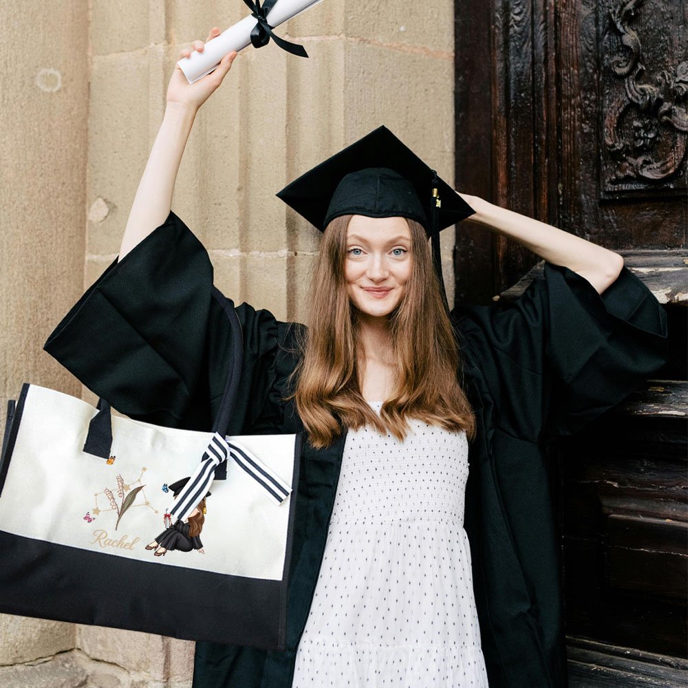 Diese Tragetasche kombiniert ein Horoskop und einen Cartoon-Absolventen mit Geburtsblumen, was sie zu einem bedeutungsvollen Andenken für jeden Absolventen macht. Personalisiere sie mit ihrem Namen und wähle ihr Lieblings-Outfit für die Abschlussfeier, von klassischen Roben bis hin zu eleganten Kleidern, um ihren Stil und ihre Leistungen zu unterstreichen.