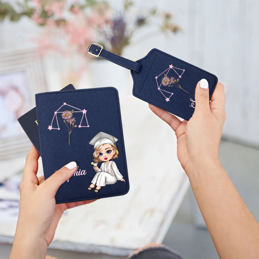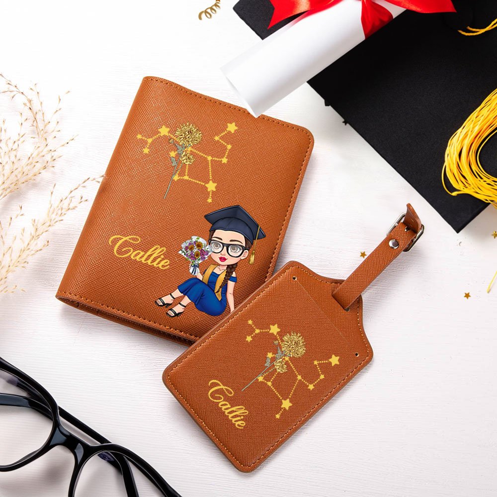 Dieser personalisierte Reisepasshalter und Gepäckanhänger ist das perfekte Geschenk für jeden Absolventen! Jedes Mädchen kann ihr Bild entsprechend ihrem Lieblingsabsolventen-Outfit anpassen, einschließlich klassischer Junggesellenkleider und eleganter Kleider, die den wichtigen Moment ihres Abschlusses und eine strahlende Zukunft symbolisieren. Darüber hinaus personalisierte Horoskop Geburt Blumen und Namen machen dieses Geschenk mehr persönlich.