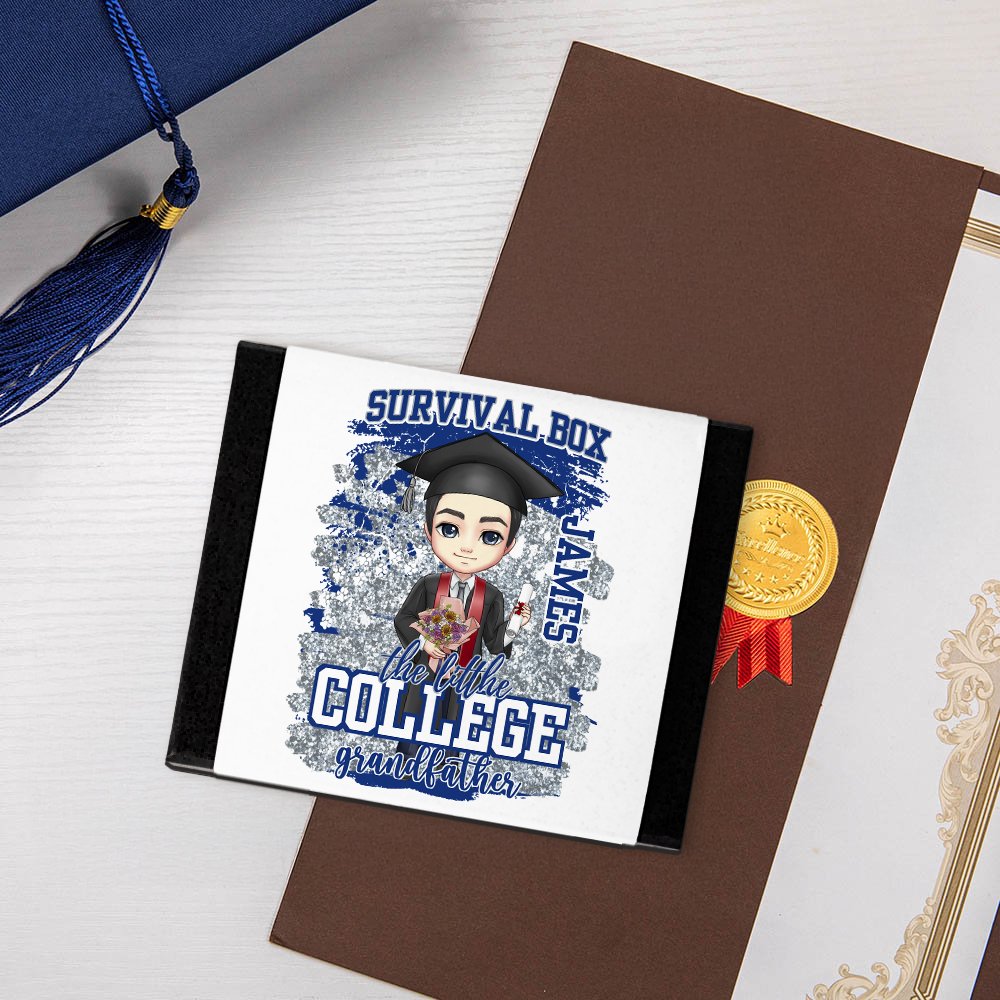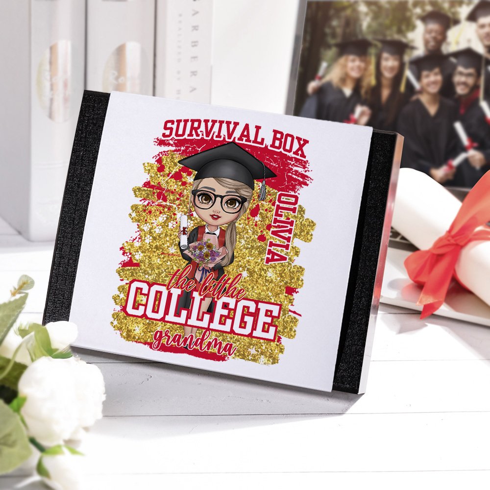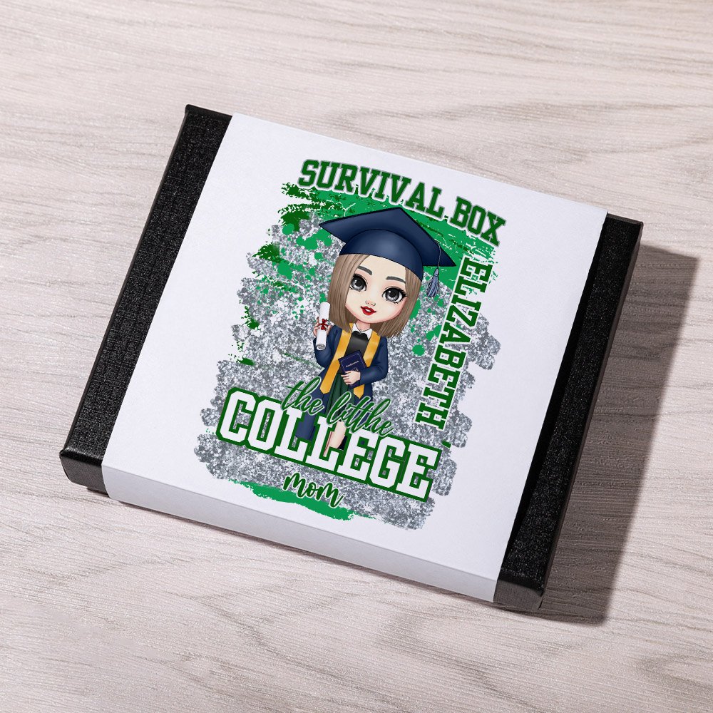 Diese personalisierte Survival-Box bringt eine zusätzliche Schicht von Spaß und Personalisierung, einschließlich einer benutzerdefinierten Cartoon-Absolvent Bild, Geber und Neuling Namen, die Schaffung eines wirklich einzigartig und unvergesslich College Care-Paket für die High-School-Absolventen. Die verspielte, feierliche Stimmung der Box spiegelt die Aufregung über den Abschluss und den Weg zum College wider.
