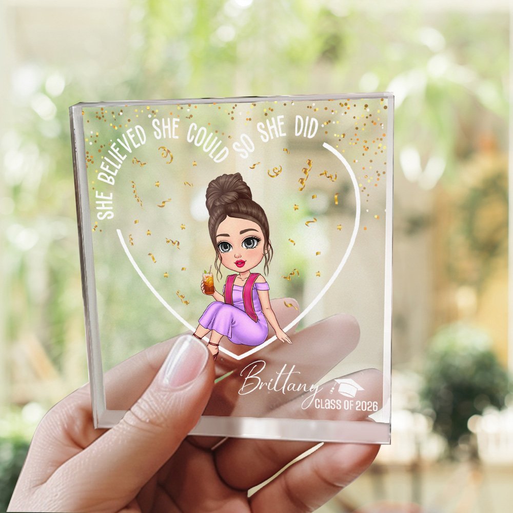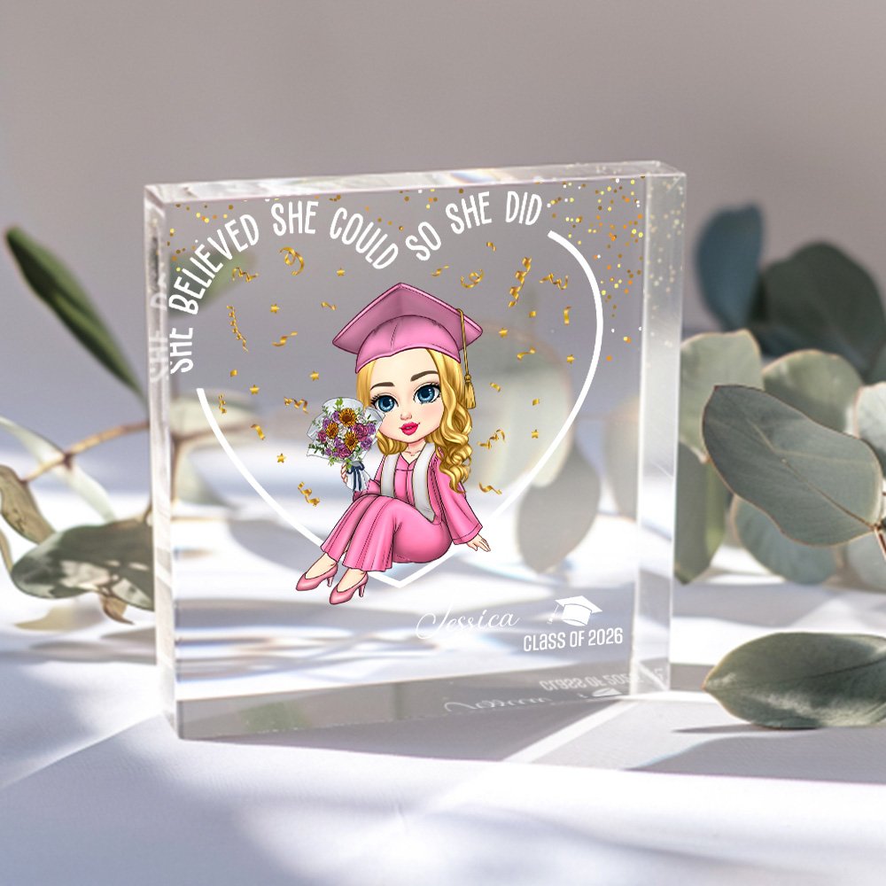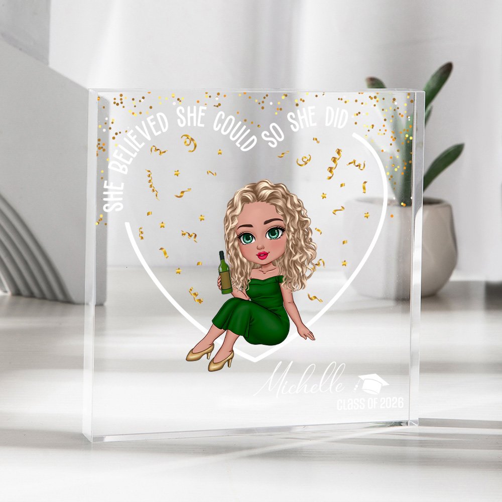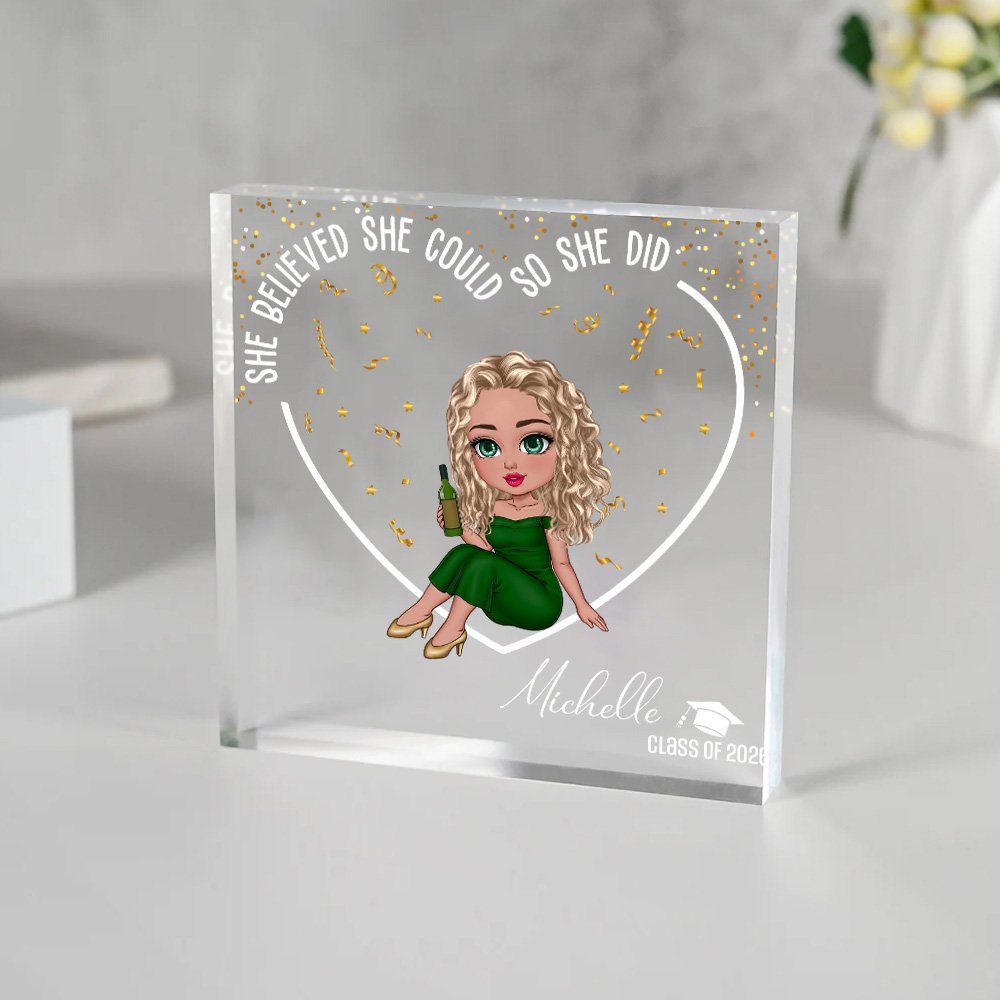 Feiern Sie eine bedeutende Leistung mit unserer personalisierten Acrylplakette, die zu Ehren von Hochschul- oder Uni-Absolventen entworfen wurde. Jede Plakette kann mit dem Namen des Absolventen, dem Jahr des Abschlusses und einer Zeichentrickfigur personalisiert werden und ist somit ein einzigartiges und bedeutungsvolles Erinnerungsstück.