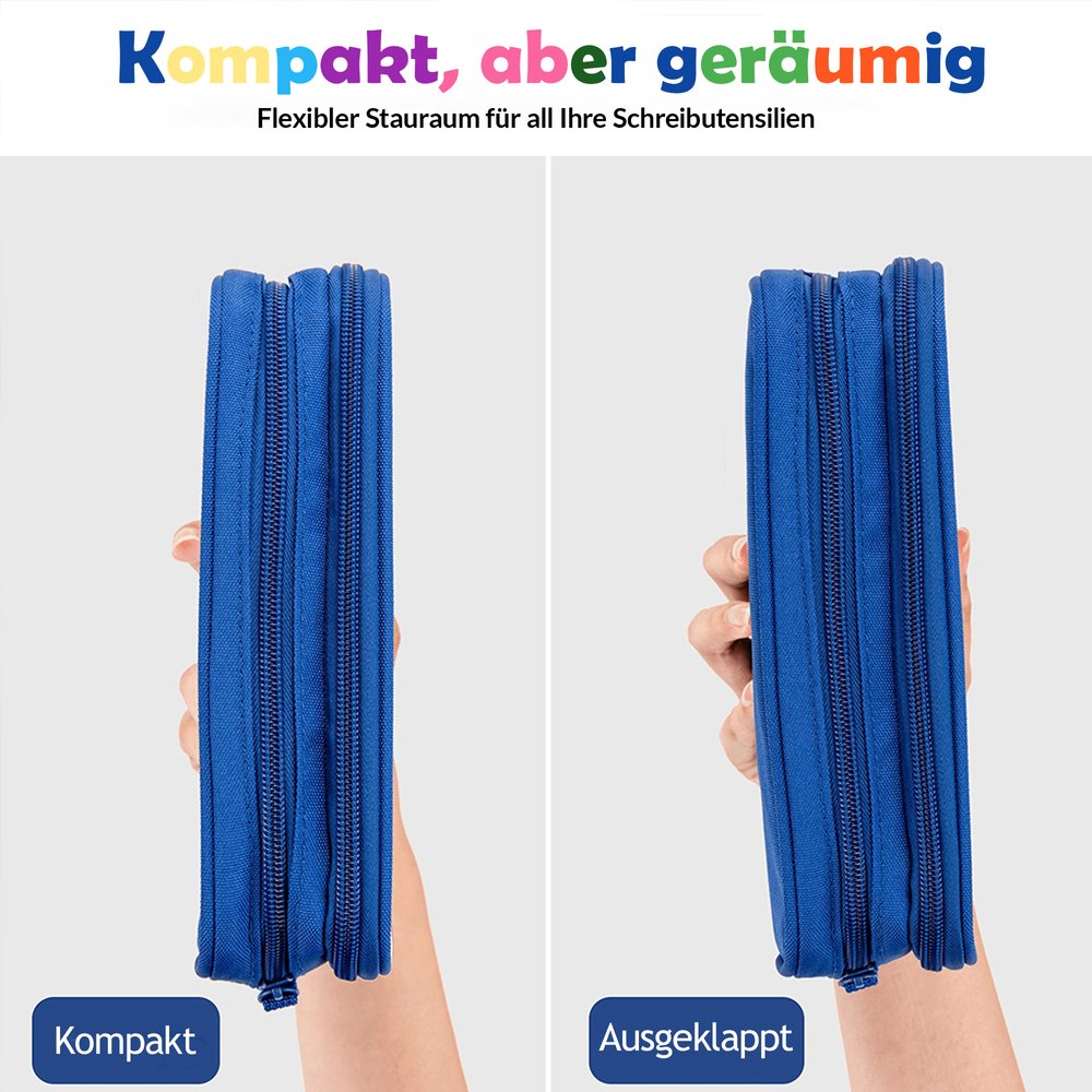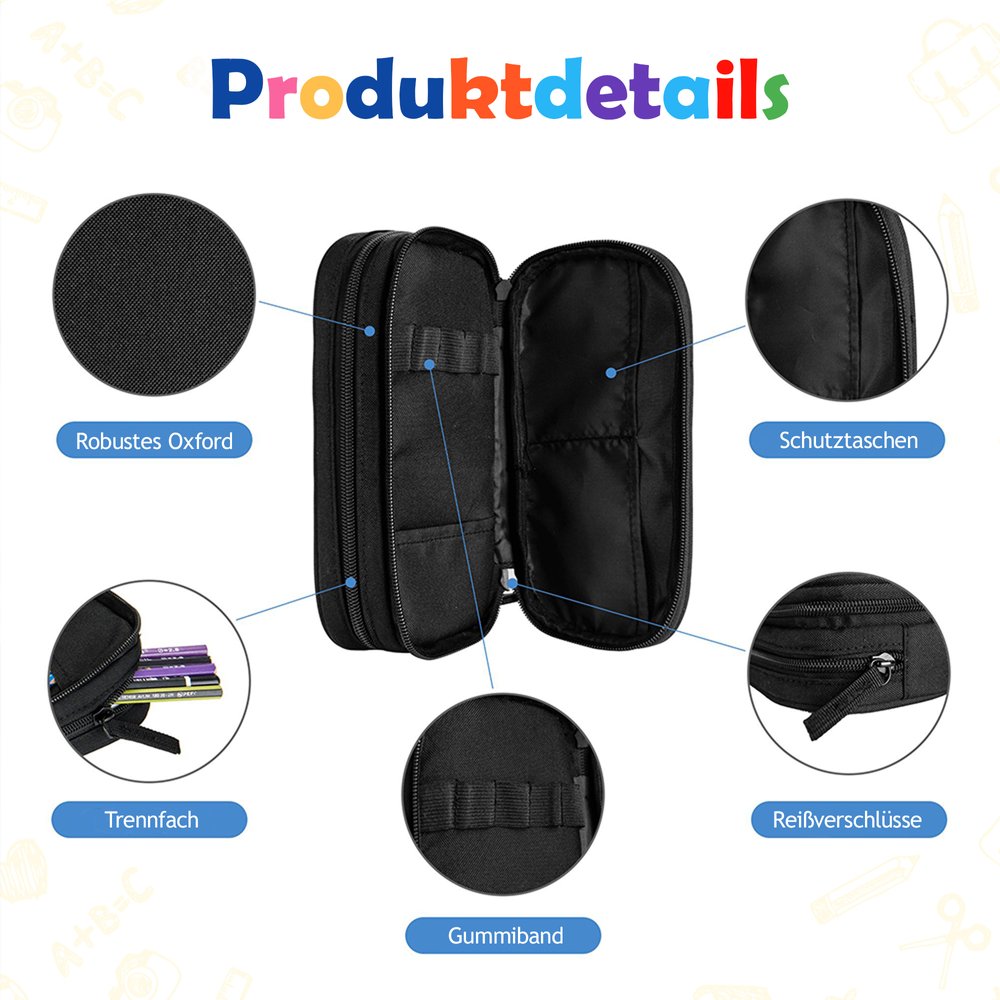Das Produkt ist aus hochwertigem Polyester gefertigt, was es robust und verschleißfest macht. Es ist für den täglichen Gebrauch geeignet, da es nicht leicht zu verformen oder zu beschädigen ist. Es ist nicht empfindlich gegen Druck durch Schultaschen oder Reibung durch Tische. Das Produkt ist pflegeleicht und langlebig. Es lässt sich einfach abwischen und Flecken können so entfernt werden. Der robuste Reißverschluss gewährleistet den sicheren Schutz der Schreibwaren der Kinder.