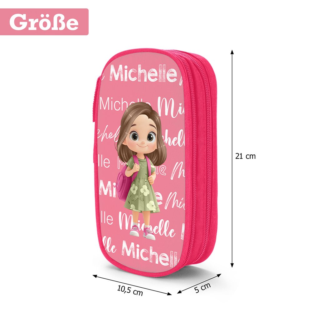 Für die Gestaltung stehen Ihnen drei verschiedene Mäppchenfarben sowie 17 Hintergrundfarben zur Auswahl. Außerdem haben Sie die Möglichkeit, Ihr Kind mit einem exklusiven Cartoon-Motiv individuell zu gestalten. Die Namensanpassung macht das Mäppchen unverwechselbar – der Name des Kindes wird in verschiedenen Schriftarten gedruckt. Unser Produkt umfasst eine große Vielfalt an Mustern und Farben, mit denen Sie das Mäppchen ganz nach den persönlichen Vorlieben Ihres Kindes gestalten können. So entsteht eine einzigartige Schreibwarenwelt, die genau auf Ihr Kind zugeschnitten ist.