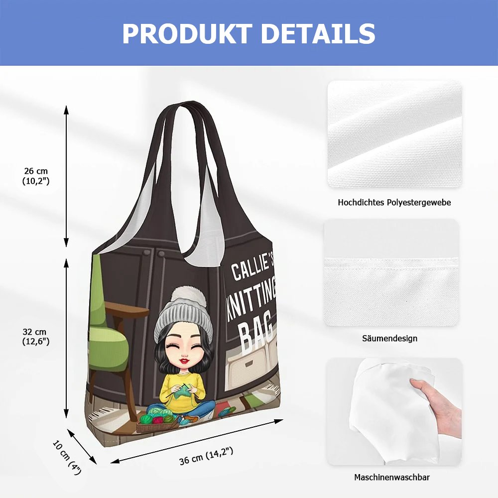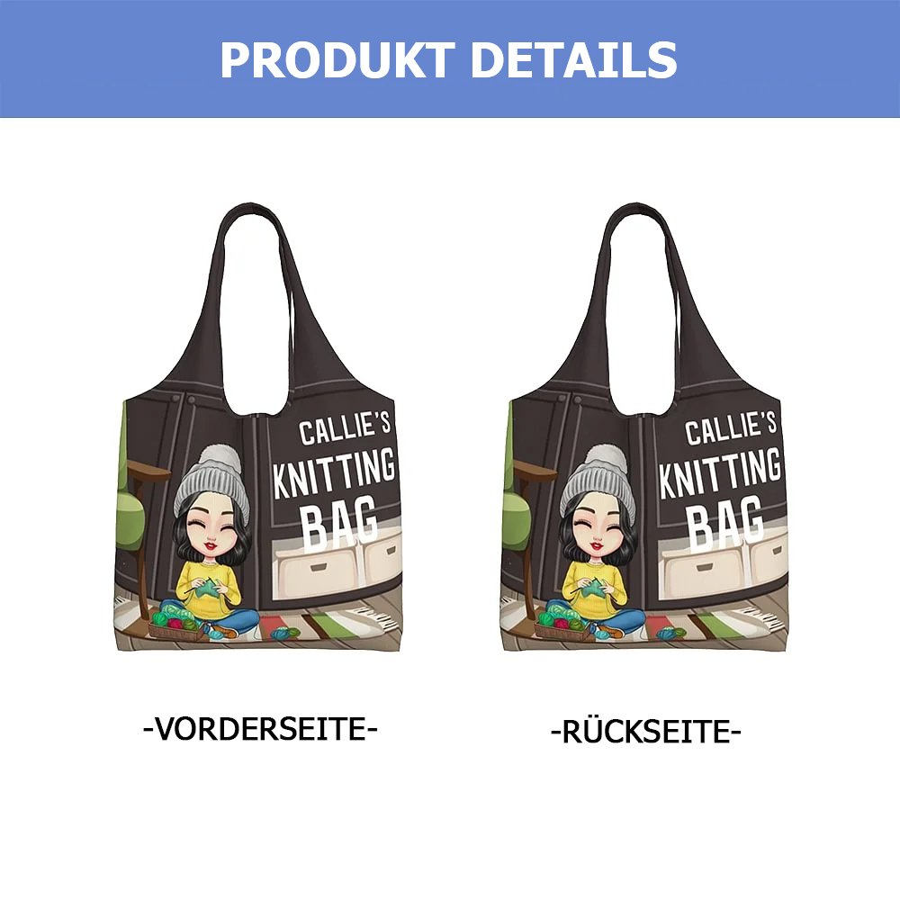 Diese Tasche wurde speziell für Damen entworfen, die gerne stricken. Sie zeigt eine niedliche Cartoon-Figur beim Stricken und ist mit der Aufschrift versehen, was sie zur perfekten Wahl für Strickbegeisterte macht. Darüber hinaus können Sie den Namen und sogar das Aussehen der Figur nach Ihren persönlichen Vorlieben gestalten und so eine wirklich einzigartige und personalisierte Tasche kreieren, die Ihre Persönlichkeit widerspiegelt.