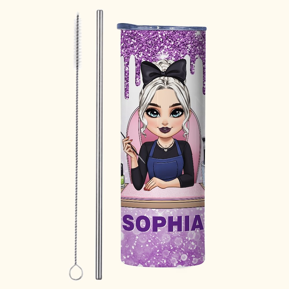Dieser atemberaubende 20-Oz-Edelstahlbecher zeigt eine anpassbare Cartoon-Maniküre-Figur und ihren Namen vor verschiedenen lebendigen Hintergründen, wie z. B. einem Hintergrund mit Glitzereffekt oder einem Hintergrund mit Nagellackständer usw. Es ist eine perfekte Möglichkeit, Individualität und Charme zu zeigen, was es zu einem idealen Accessoire für Nageltechniker und Nagelkunst-Enthusiasten gleichermaßen macht.