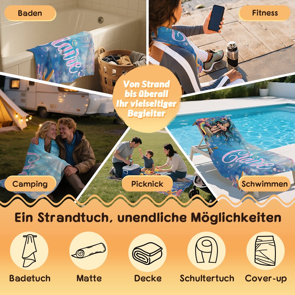 Dieses Strandtuch besticht durch ein geheimnisvolles und zugleich romantisches Cartoon-Meerjungfrau-Design, das sofort ins Auge fällt und einen besonderen visuellen Akzent setzt. Die leuchtenden Farben lassen die faszinierende Welt der Meerjungfrauen lebendig wirken. Durch die Personalisierung mit Ihrem Namen erhält das Strandtuch eine individuelle, fast künstlerische Note – so wird es zu einem ganz persönlichen Begleiter für entspannte Stunden am Strand und unterstreicht stilvoll Ihre Persönlichkeit.