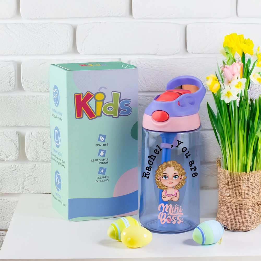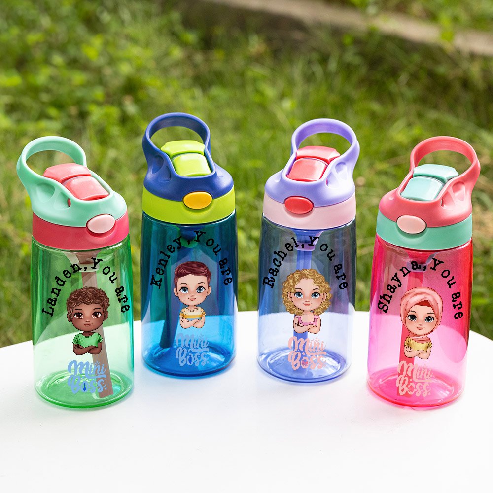 Erhältlich in vier leuchtenden Farben, zeigt diese Wasserflasche niedliche Cartoon-Mädchen und Jungen, die lebendig und voller Kindlichkeit sind. Sie hat nicht nur den festen Text "Mini Boss", sondern Sie können auch den Namen Ihres Kindes auf der Wasserflasche angeben, um ihr einen Hauch von Persönlichkeit und Kreativität zu verleihen.