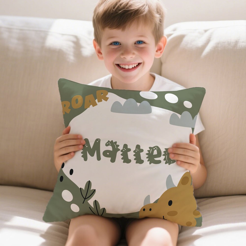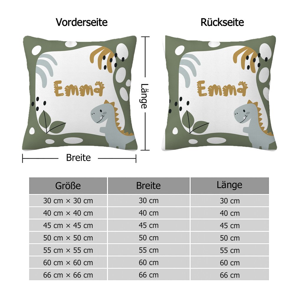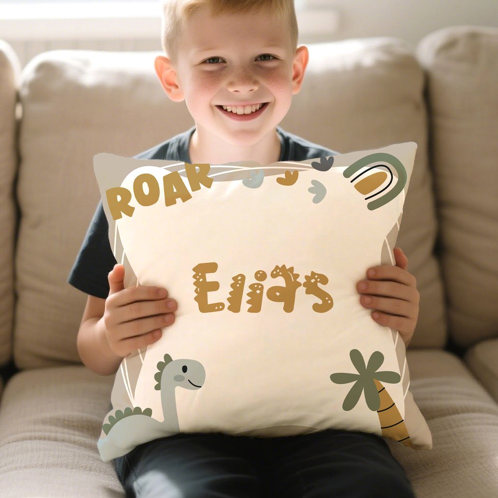 Mit den liebevoll gestalteten Dinosaurier-Motiven als Herzstück und dem individuell anpassbaren Kindernamen entsteht eine fantasievolle, personalisierte Cartoon-Welt. Lebendige Farben unterstreichen das majestätische und gleichzeitig niedlich-verspielte Aussehen der Dinos. Durch den Namen erhält jedes Kissen eine ganz persönliche Note und wird für Kinder zu einem ganz besonderen Begleiter. So bringt es Farbe, Freude und Persönlichkeit ins Kinderzimmer.