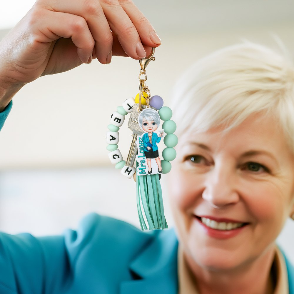 Mit Cartoon-Figuren zum Teacher's Day und bunten Perlen, die "TEACH" buchstabieren, gepaart mit lustigen Quasten und Acryl-Anhängern zum Thema Lehrer. Es unterstützt die Anpassung von Cartoon-Charakter Details. Jeder Schlüsselanhänger wird durch die individuelle Gestaltung zum Unikat und damit zu einem "durchdachten täglichen Begleiter für Lehrer".