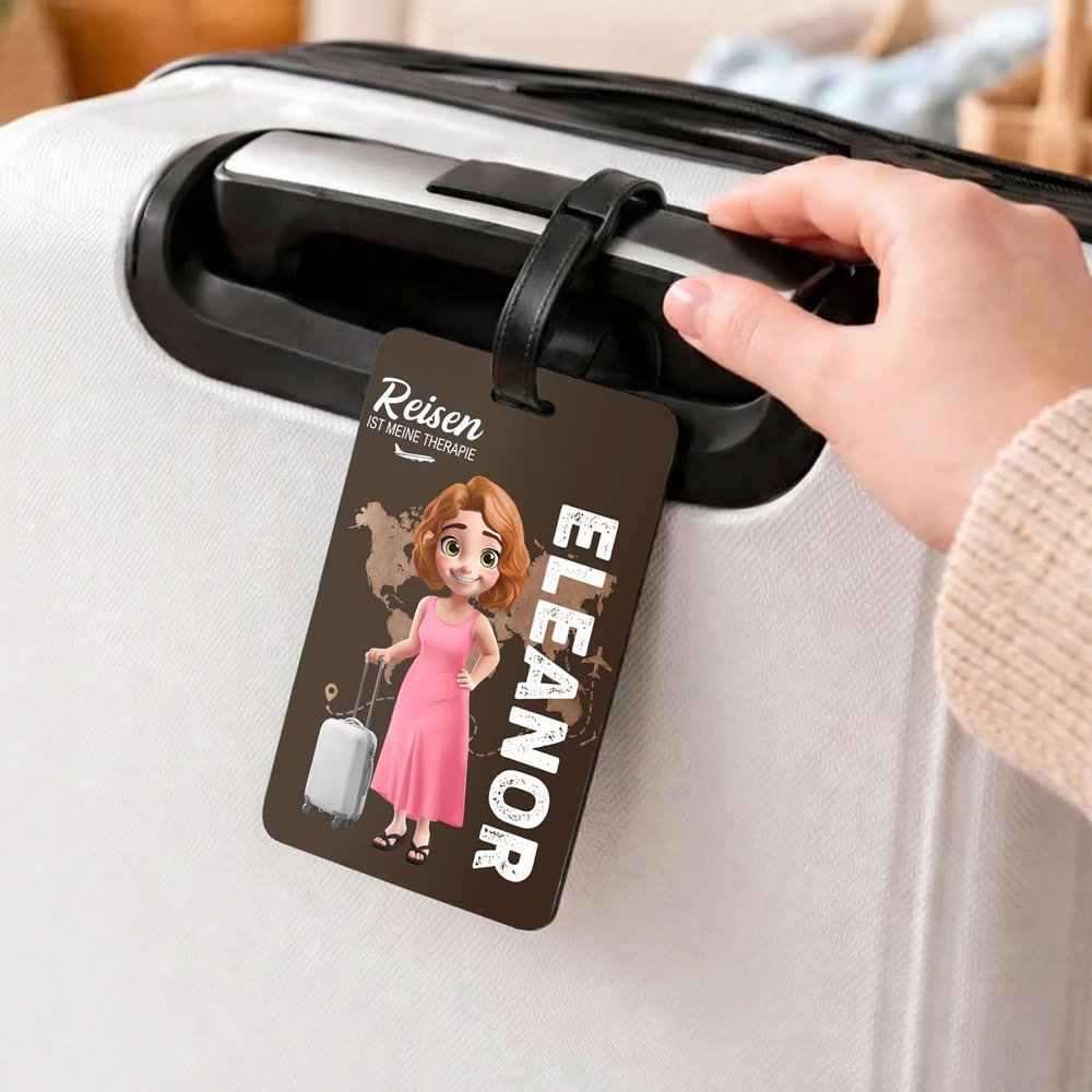Dieser Gepäckanhänger zeigt eine niedliche Cartoon-Reisefigur, die einen Koffer zieht, und ist voller Elemente rund um Reisen und Urlaub. Der Hintergrund mit einer Weltkarte, einem Flugzeug sowie humorvollem Slogan wie Reisen ist meine Therapie oder und so beginnt das Abenteuer sorgen für eine entspannte und fröhliche Atmosphäre. Außerdem können Sie den Gepäckanhänger mit Ihrem Namen personalisieren, sodass jedes Stück zu einem einzigartigen Accessoire wird.