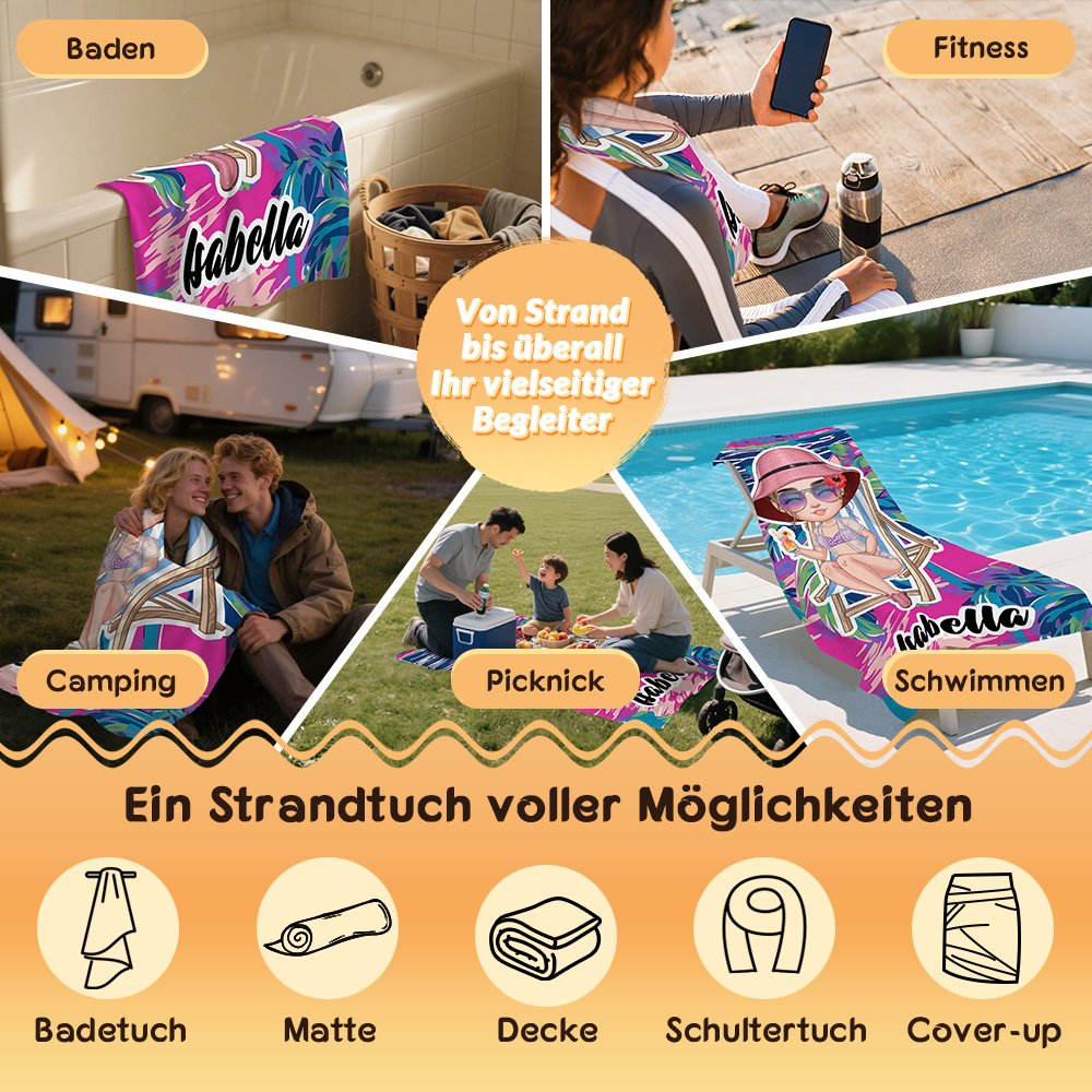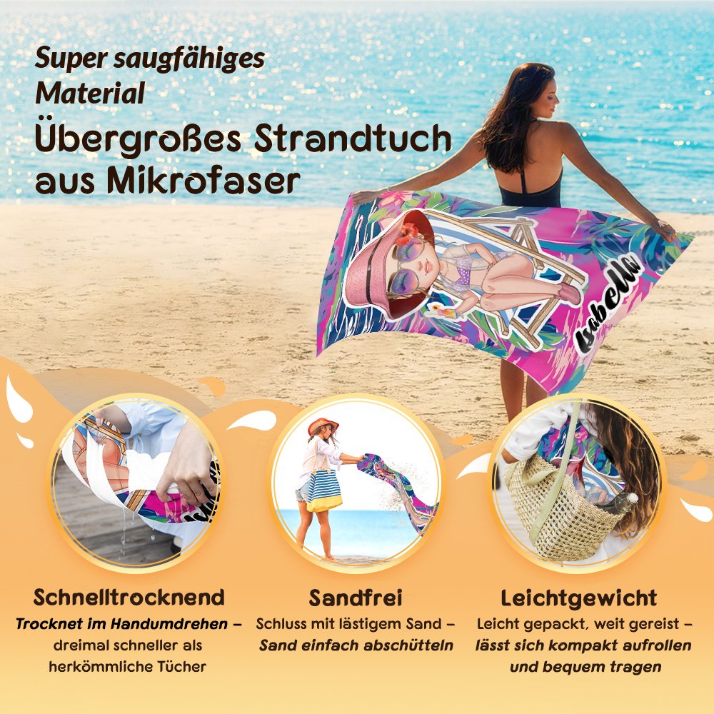 Dieses Strandtuch zeigt eine Cartoonfigur mit Urlaubsstimmung, die auf einem Liegestuhl sitzt, ein Getränk in der Hand hält und Entspannung und Energie ausstrahlt. Es bietet 10 Hintergrundmotive mit tropischen Kokospalmen, Palmenblättern und Wellen und ermöglicht es Ihnen, Ihren eigenen Namen hinzuzufügen, um die Urlaubsatmosphäre perfekt einzufangen.