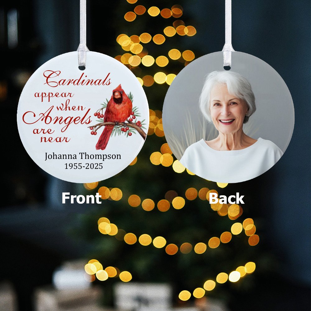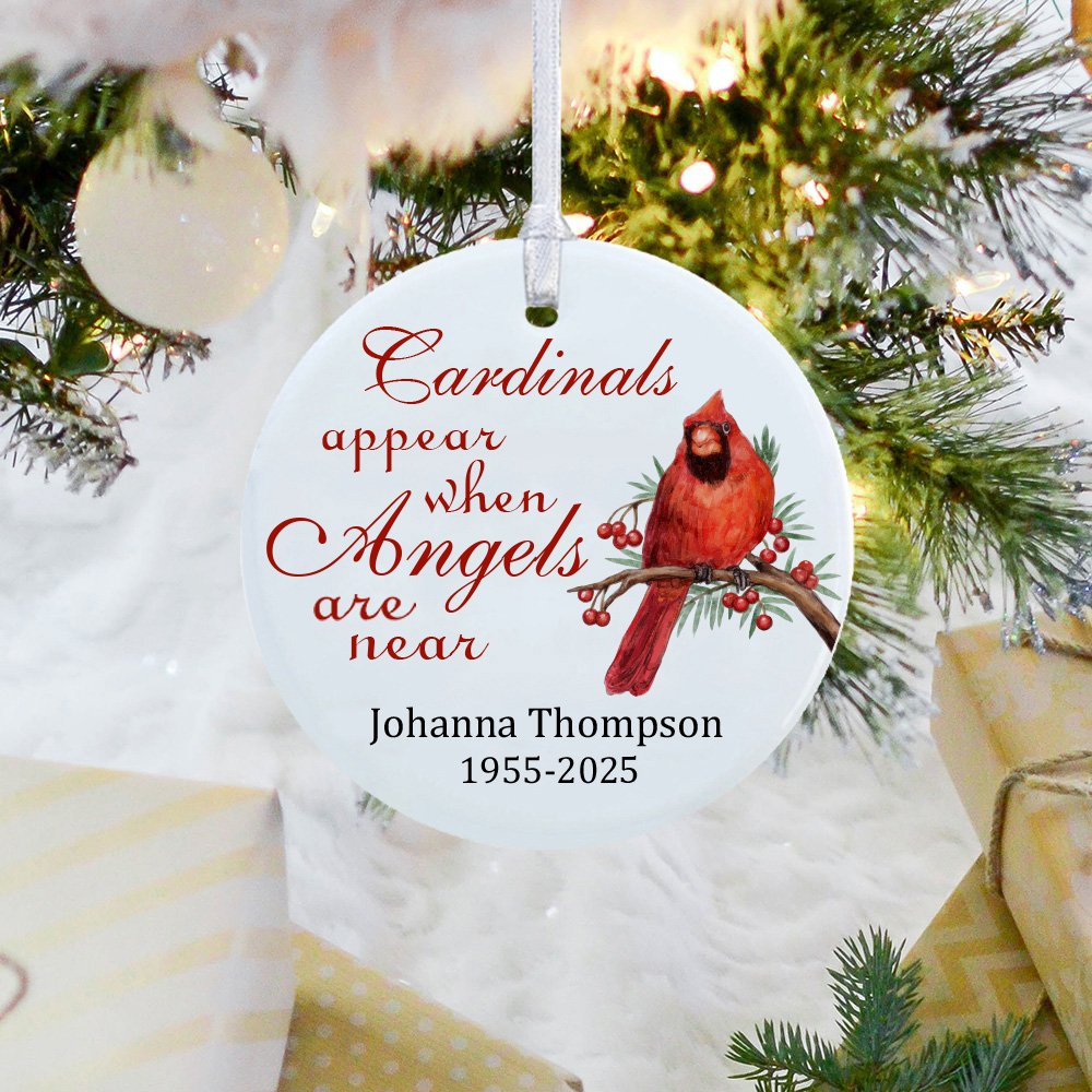 Einen Kardinalvogel zu sehen, kann als Zeichen der Geister oder als Botschaft eines verstorbenen geliebten Menschen gedeutet werden. Die Botschaft "Kardinäle erscheinen, wenn Engel in der Nähe sind" ist auf das Ornament gedruckt, das ein Geschenk für den Verlust eines geliebten Menschen ist. Hängen Sie dieses Symbol der Hoffnung auf oder schenken Sie es jemandem, der eine Aufmunterung braucht.