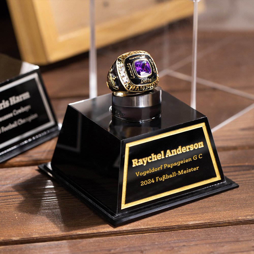 Die Meisterschaft Ring-Vitrine ist der perfekte Weg, um Ihre hart verdienten Sport Meisterschaft-Ringe zu präsentieren. Der schwarze Sockel verleiht der Präsentation einen Hauch von Eleganz, und die klare Acrylabdeckung ermöglicht eine einfache Betrachtung und schützt Ihre Ringe vor Staub und Verblassen.