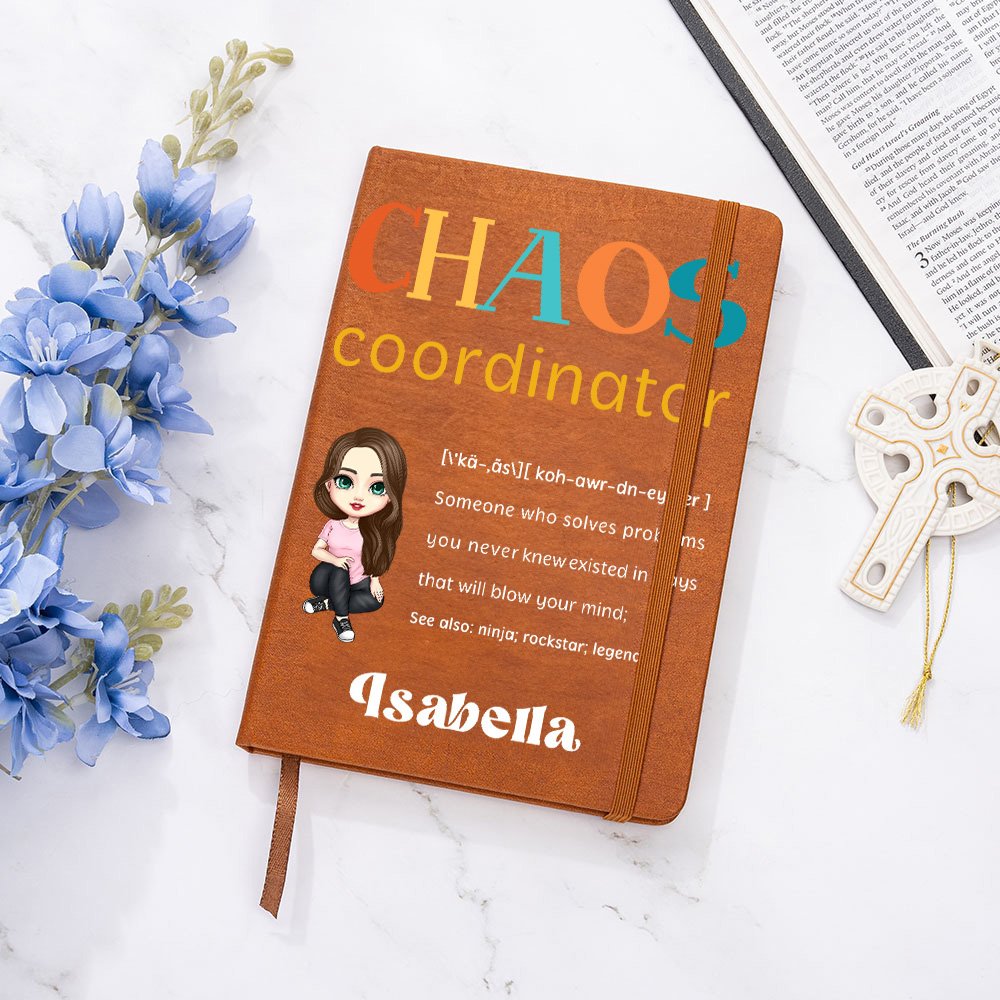 Der braune Einband dieses Notizbuchs lässt es ruhiger und klassischer wirken. Der farbenfrohe Titel "Chaos Coordinator" auf dem Einband bringt Spaß und Vitalität in dieses Notizbuch. Mit einer niedlichen Cartoon-Figur, die auf Ihrem Bild basiert, bringt es Ihre einzigartige Persönlichkeit zur Geltung. Sie können auch Ihren Namen einfügen und jedes Notizbuch zu einem besonderen Kunstwerk machen.