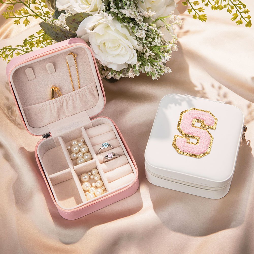 Das Schmuckkästchen ist mit einem Chenille-Aufnäher versehen, sodass Sie einen Buchstaben wählen und ihn personalisieren können, um ein einzigartiges Schmuckkästchen zu schaffen!
