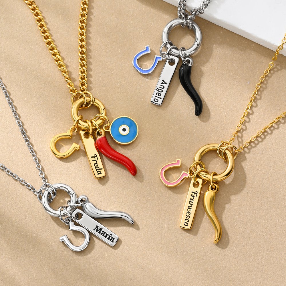 Im Mittelpunkt dieser Halskette stehen traditionelle Glückssymbole, die klassische Elemente wie die Chili (italienisches Cornicello), den bösen Blick, das vierblättrige Kleeblatt und das Hufeisen in frei gestaltbaren Anhängern zusammenbringen. Die Halskette kann auch mit einem Namen personalisiert werden, was jedes Tragen zu einem einzigartigen Statement des individuellen Stils macht.