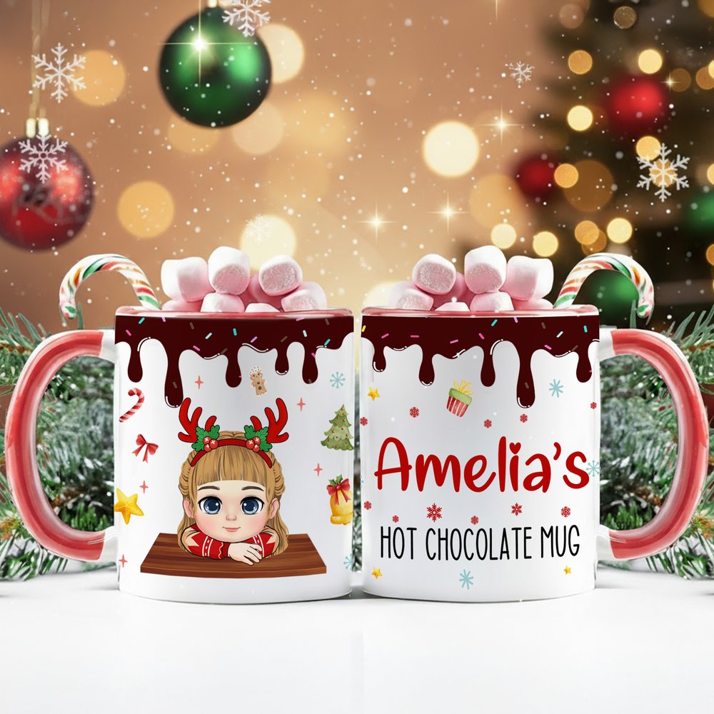 Die Oberseite des Bechers simuliert einen fließenden Schokoladensaucen-Effekt und verleiht ihm einen Hauch von Süße. Der Hauptteil zeigt liebenswerte Weihnachtsfiguren mit klassischen Weihnachtsmannmützen und lebhaften Augen, die festliche Freude vermitteln. Die Umgebung ist mit lebhaften und harmonischen Weihnachtsmotiven verziert, darunter Weihnachtsbäume, Schneeflocken und Sterne. Individuell anpassbare Namen machen die Tasse einzigartig und lassen sofort eine festliche Atmosphäre aufkommen.