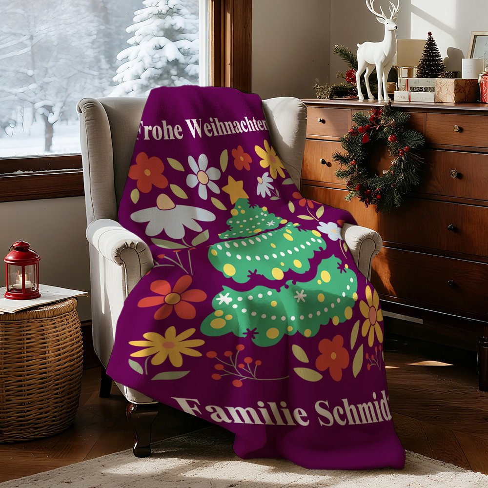 Diese Decke ist mit sechs farbenfrohen Blumenmustern und einem Weihnachtsbaummotiv erhältlich und kann in acht optionalen Hintergrundfarben gestaltet werden. Sie lässt sich mit Namen und Grüßen individualisieren und wird dadurch besonders lebendig und einzigartig. Es ist keine zusätzliche Dekoration erforderlich; Sie müssen sie lediglich ausbreiten, um sofort eine festliche Atmosphäre zu schaffen, die Ihrem Alltag eine feierliche Note verleiht und ganz Ihren persönlichen Wünschen entspricht.