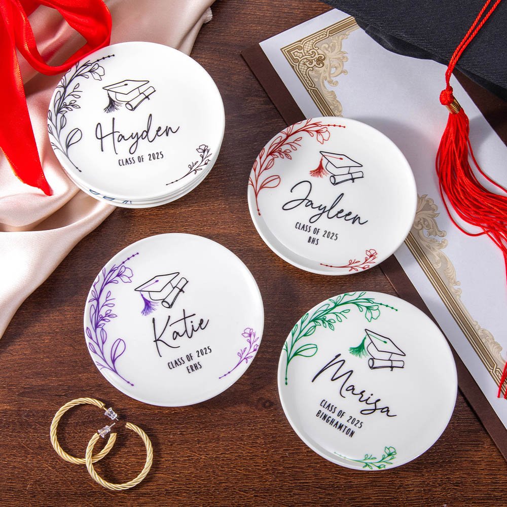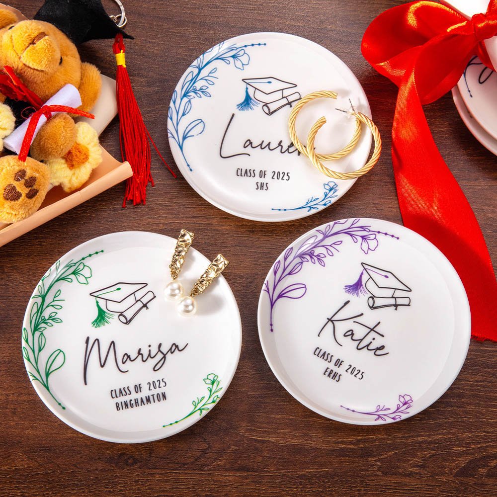 Feiern Sie die Errungenschaften der Klasse von 2025 mit dieser schönen Schmuckschale. Die Schale mit dem Design einer Abschlusskappe kann mit dem Namen des Absolventen, dem Jahr des Abschlusses und dem Namen der Schule personalisiert werden. Eine herzliche Art, die besten Wünsche zu übermitteln und an den besonderen Tag zu erinnern.