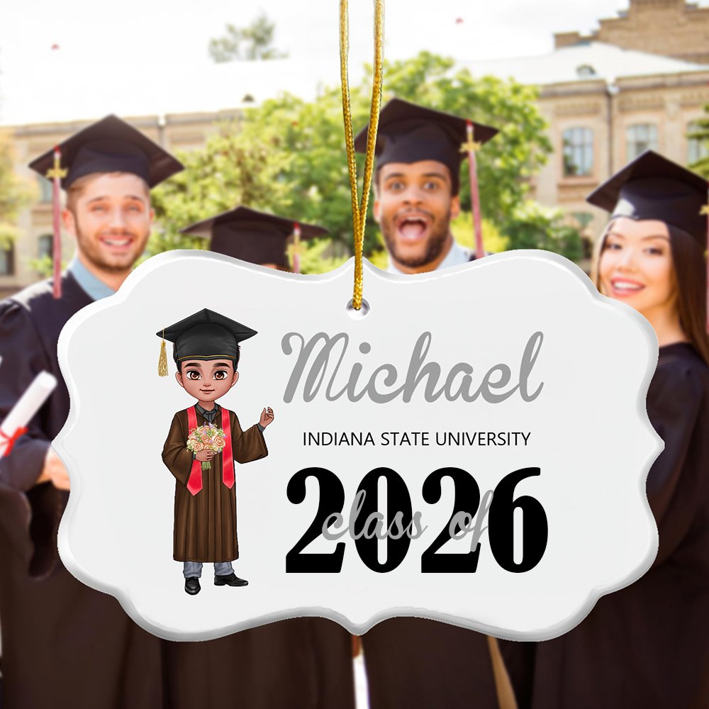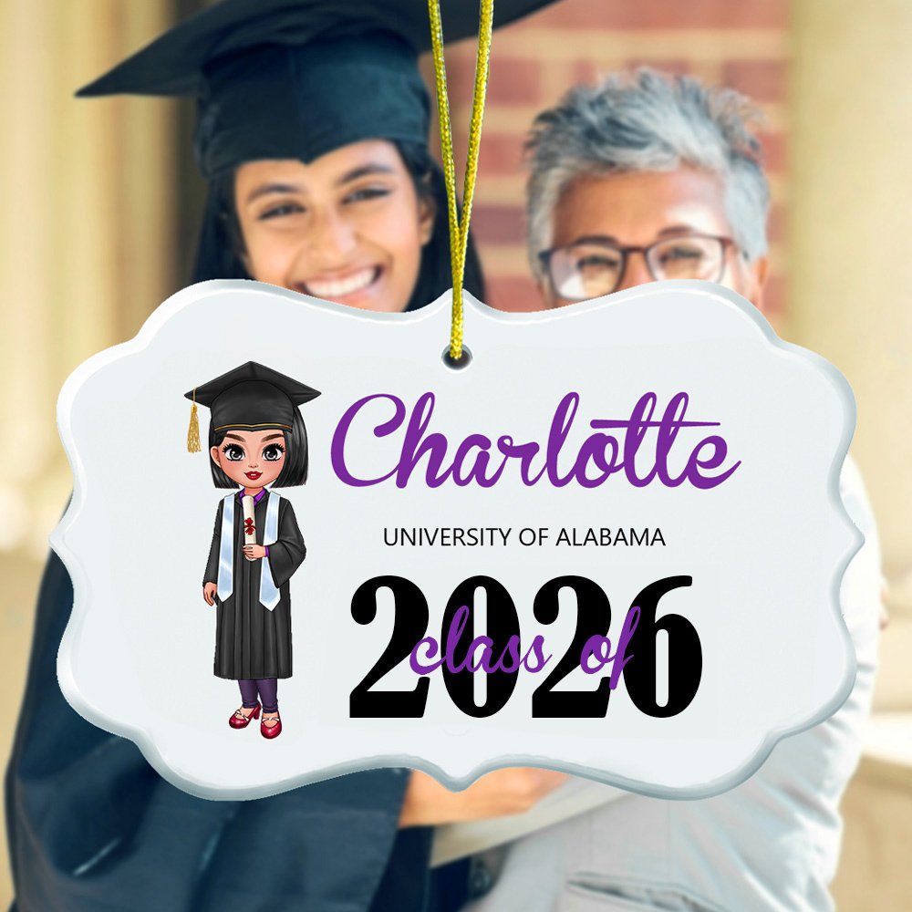 Feiern Sie Ihren Schulabschluss mit unserem personalisierten, unregelmäßigen Keramik-Ornament. Mit einer anpassbaren Cartoon-Figur mit verschiedenen Frisuren, Abschlusskleidern, Blumensträußen usw. wird jedes Stück exklusiv für den Absolventen entworfen und ist somit ein außergewöhnliches Andenken. Sie können auch Ihren Namen, das Jahr des Abschlusses und den Namen der Universität angeben.