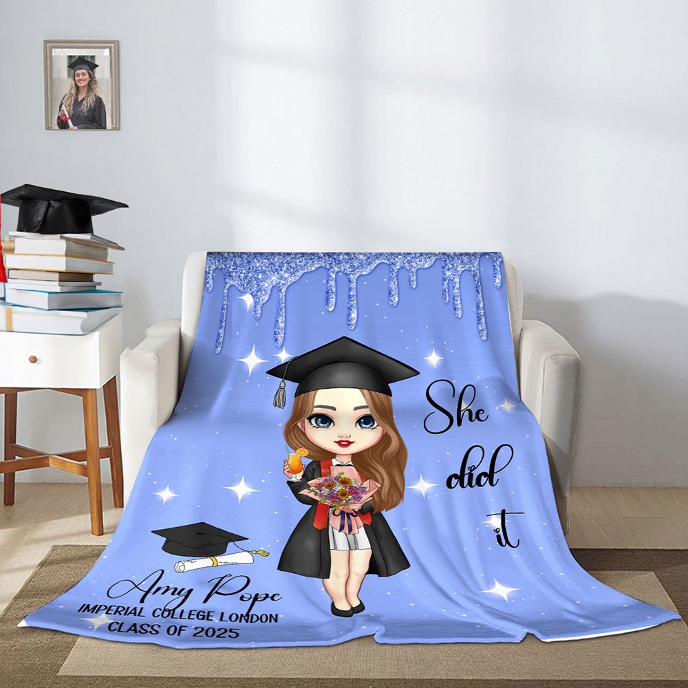 Feiern Sie Ihre Leistung mit einer personalisierten Abschlussdecke mit einer Cartoon-Figur, die Sie repräsentiert! Fügen Sie Ihren Namen, das Abschlussjahr und die Schule hinzu, um ein einzigartiges Andenken zu schaffen, das Ihre harte Arbeit und Ihren Erfolg würdigt. Auf der Decke steht außerdem der feierliche Text "Sie/Er hat es geschafft", der die fröhliche Atmosphäre noch verstärkt.