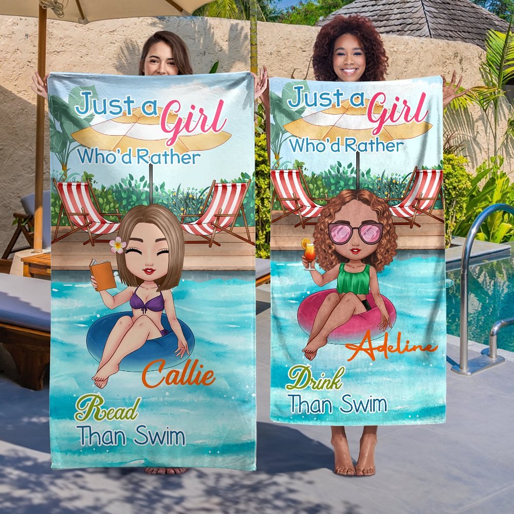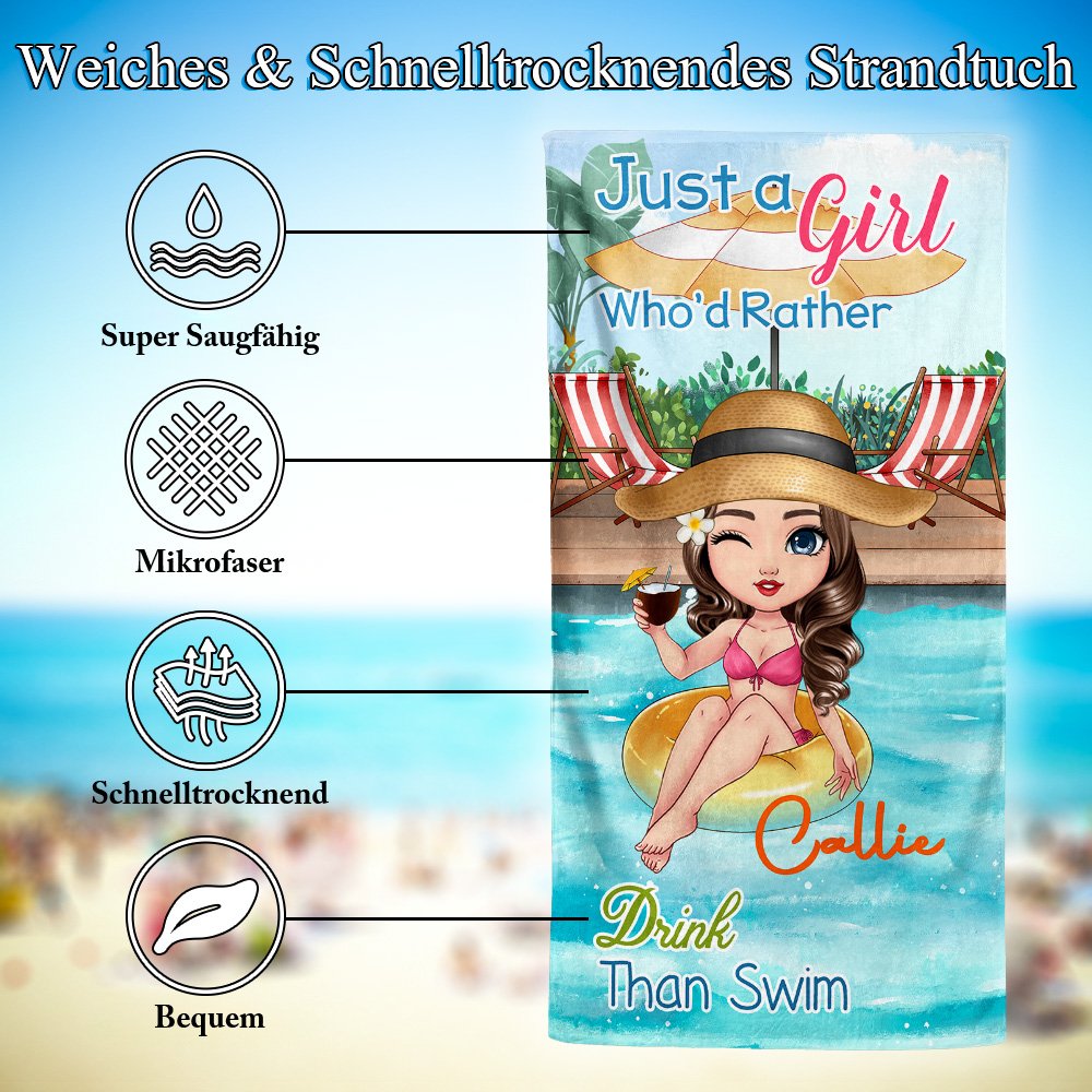 Das Design dieses Strandtuchs ist inspiriert von Kokosnuss-Strand- und Schwimmbadmotiven sowie einem lebendigen Sommerstil und besticht durch seine künstlerische Ausstrahlung. Besonders bemerkenswert ist die Möglichkeit, Cartoon-Figuren in verschiedenen Altersstufen individuell zu gestalten – beispielsweise mit persönlichen Lieblingsgetränken, Buchmotiven oder originellen Texten wie Just a Girl/Woman Who'd Rather Drink/Read Than Swim, die den besonderen Charakter unterstreichen. Verschiedene Schriftarten stehen zur Auswahl, und Ihr Name wird aufgedruckt, sodass jedes Strandtuch zu einem einzigartigen und liebevoll gestalteten Geschenk wird.