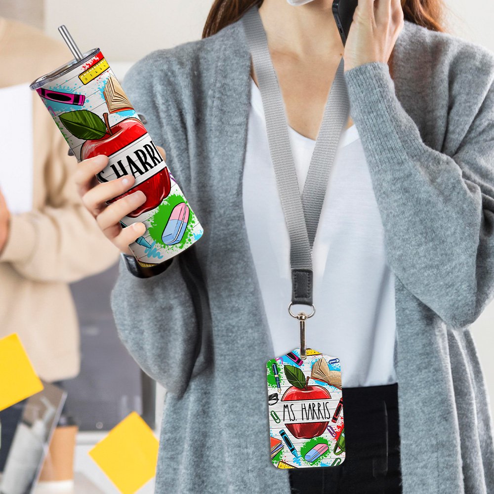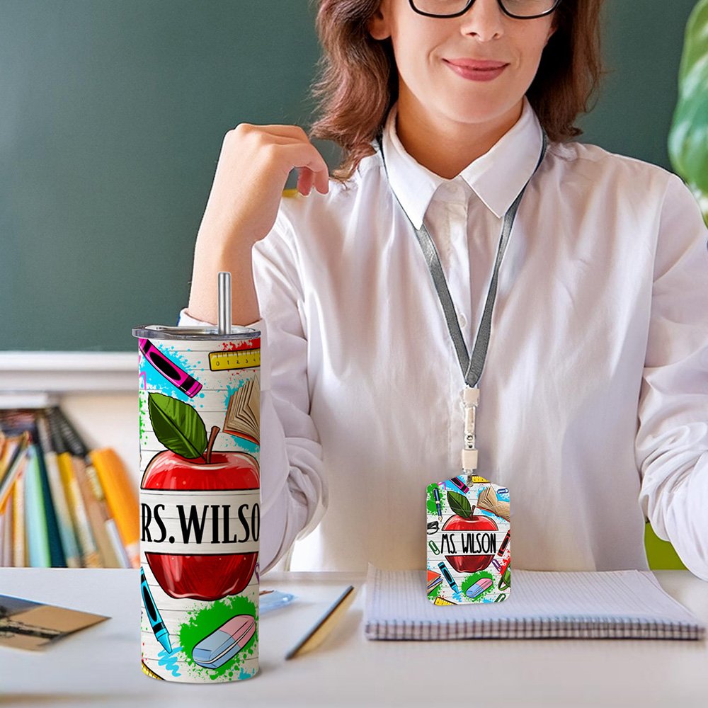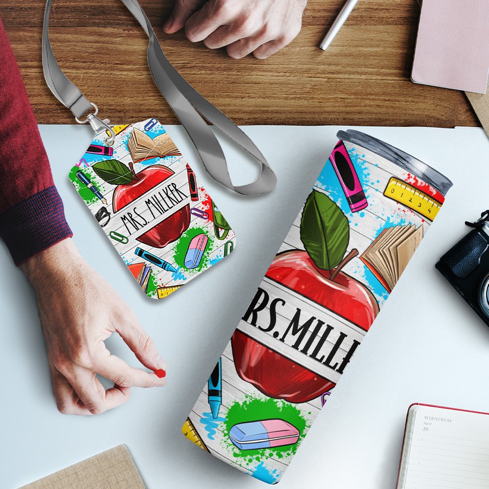 Dieses entzückende Set zeigt einen leuchtend roten Apfel mit einem anpassbaren Namen in der Mitte, umgeben von bunten Schreibwaren wie Buntstiften, Linealen und Büchern. Es zeigt anschaulich die Vielfalt der Arbeit von Lehrern.