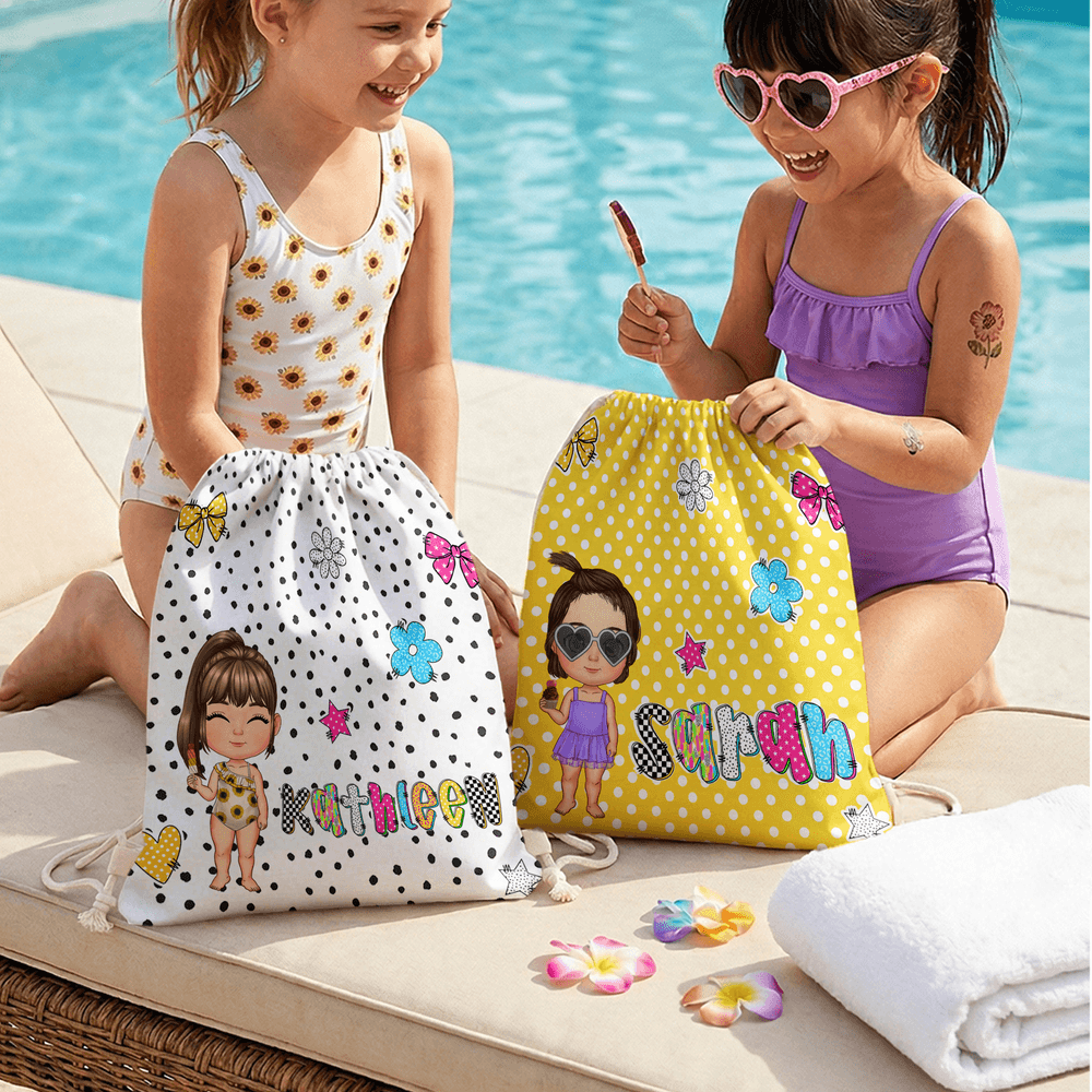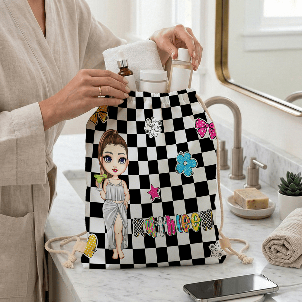 Diese Tasche mit Kordelzug zeigt eine lebendige Mischung aus Retro-Graffiti, Schachbrettmuster, Polka-Dots, Leopardenmuster, Sternen, Blumen und Cartoon-Figuren und kann mit einem eigenen Namen personalisiert werden. Sie kombiniert trendige, lustige Elemente mit einer einzigartigen persönlichen Note für einen unverwechselbaren Look.