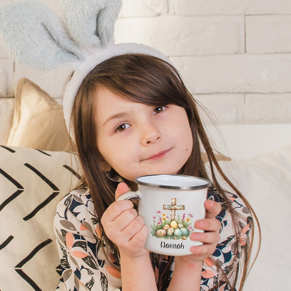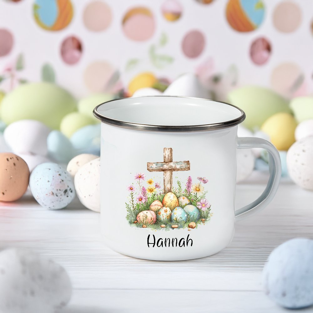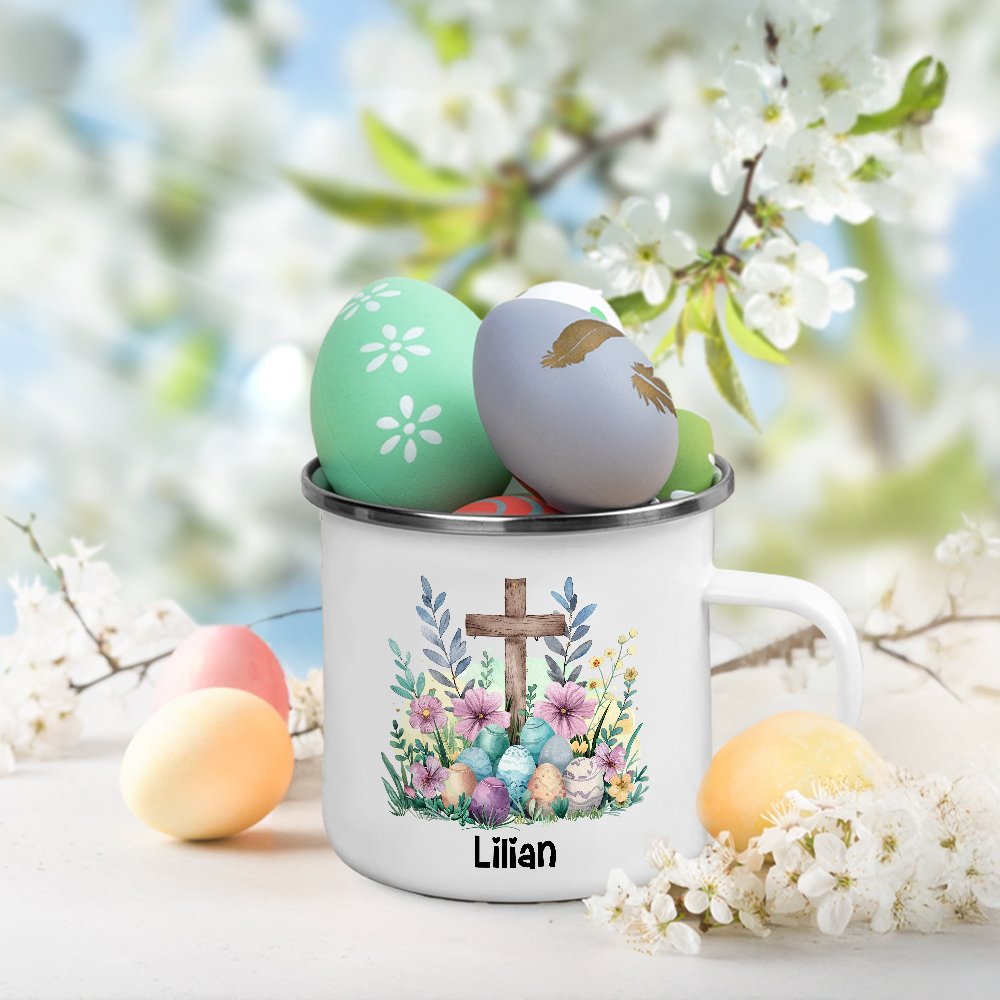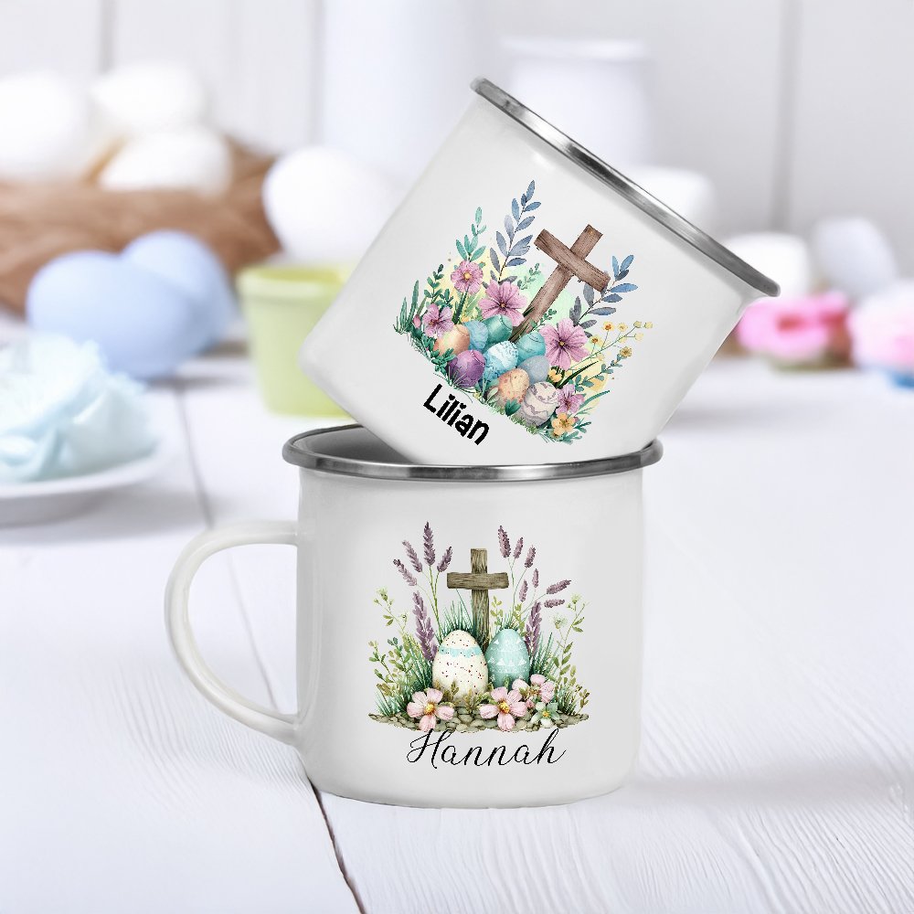Diese Emaille-Tasse zeigt österliche Elemente, eine Mischung aus Eiern, die Auferstehung und Segen symbolisieren, exquisiten Blumenmustern und klassischen Kreuzmustern, von denen 11 zur Auswahl stehen, voller festlicher Heiligkeit und frühlingshafter Lebendigkeit. Die Tassen können auch mit Namen versehen werden, um ein einzigartiges Geschenk für jeden Benutzer zu schaffen.