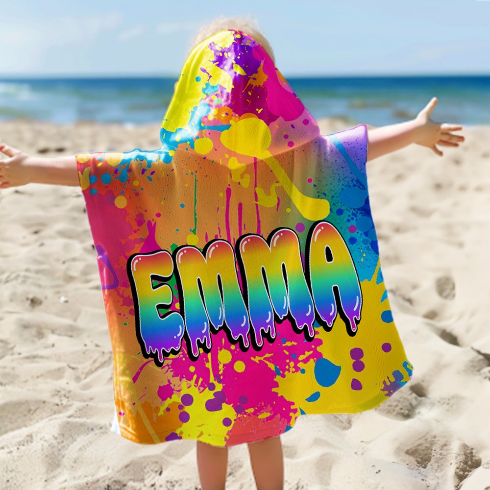 Personalisierte bunte Graffiti-Stil schnell trocknen Hooded Strandtuch mit Farbverlauf Regenbogen Name Reise Verwendung Sommer Urlaub Geburtstag Geschenk für Kinder