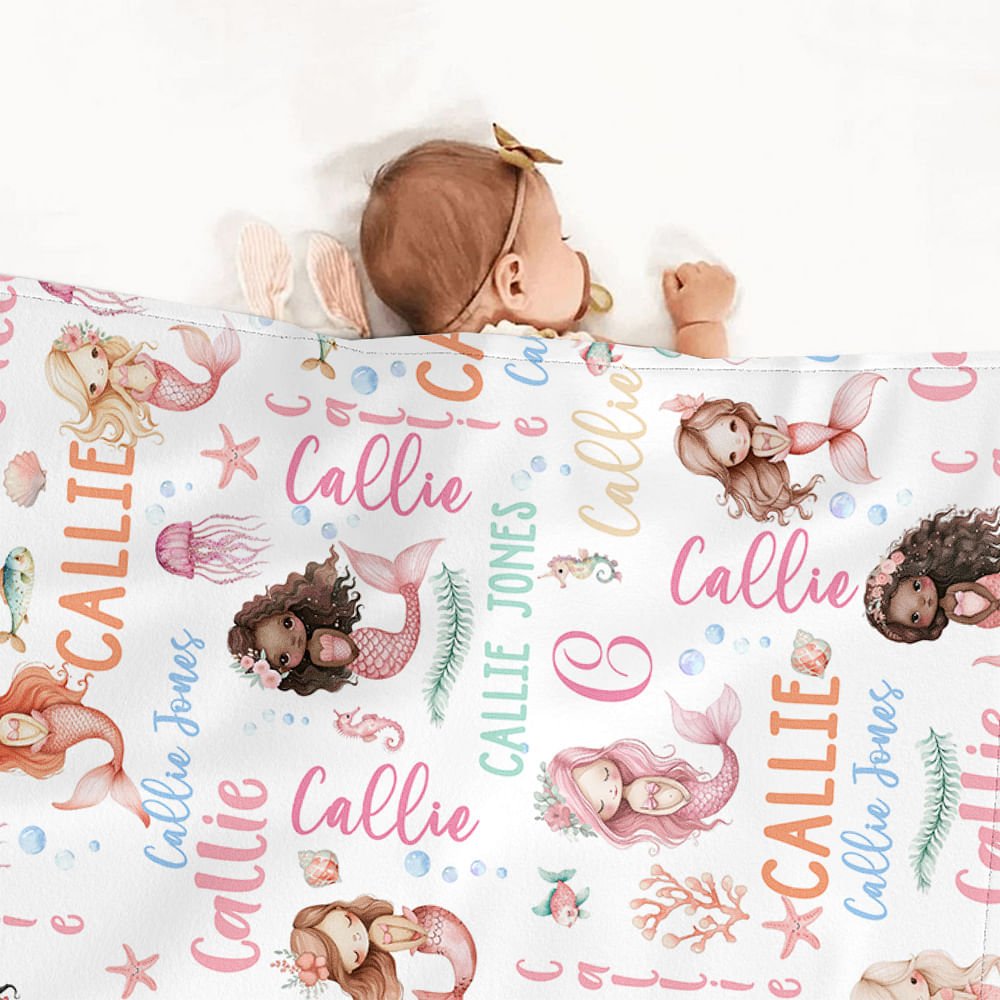 This blanket features a vibrant and charming design that showcases adorable mermaids, sparkling seashells, and playful ocean elements. The colorful illustrations bring the underwater world to life, making it an enchanting centerpiece for your baby's nursery. Plus, you can customize it with your and your child's first name, full name, initials, and more for a one-of-a-kind magical ocean adventure.
