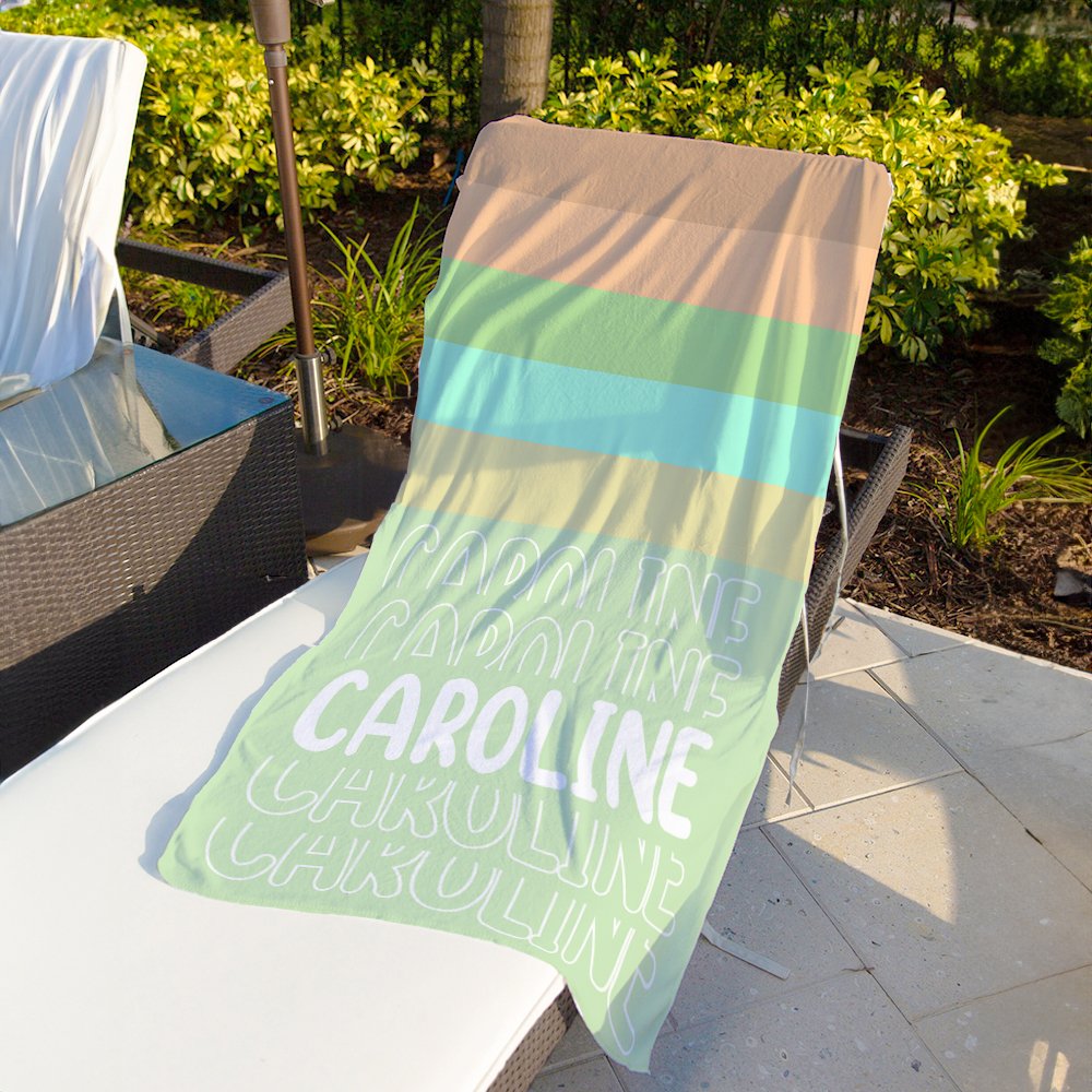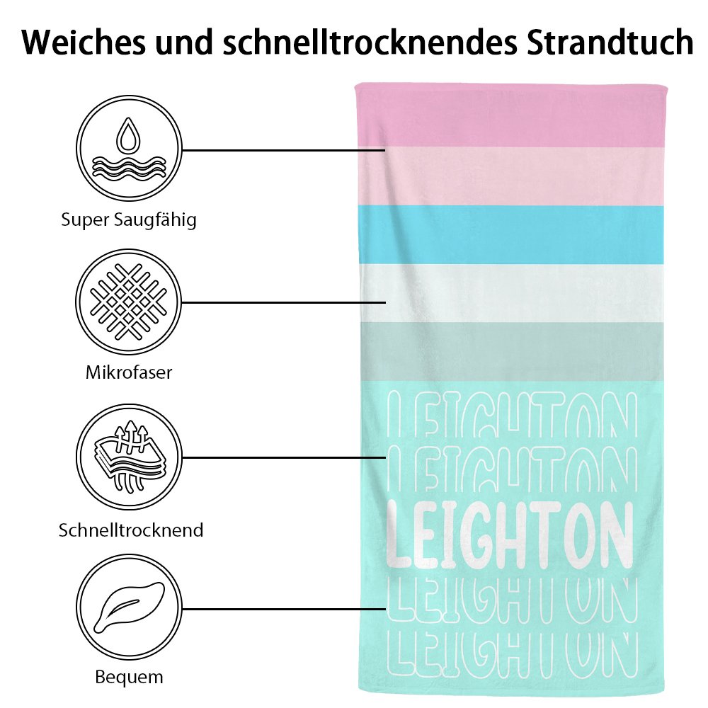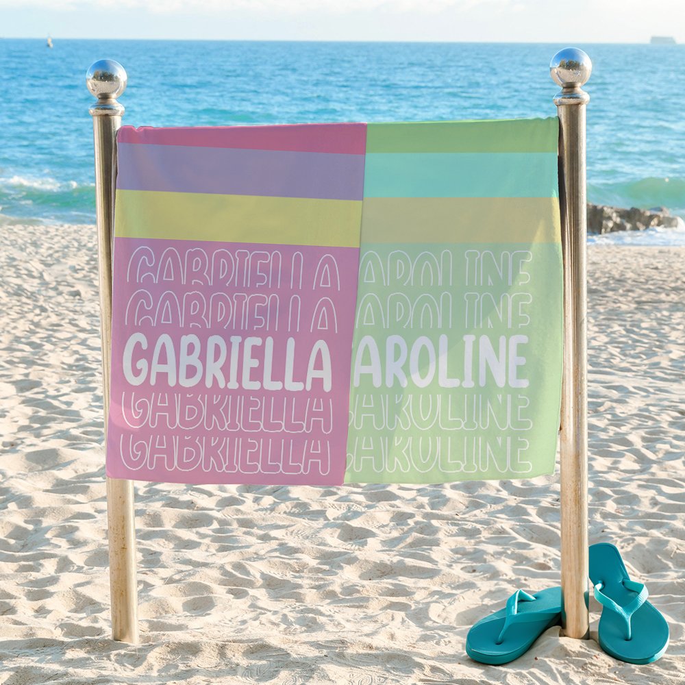 Dieses personalisierte Strandtuch verfügt über ein helles, auffälliges Streifenmuster, das eine erfrischende und energiegeladene Atmosphäre ausstrahlt. Sie können ein bevorzugtes Farbschema auswählen und einen individuellen Namen hinzufügen, so dass jedes Strandtuch ein Unikat ist, das auf Ihre individuellen Vorlieben zugeschnitten ist.
