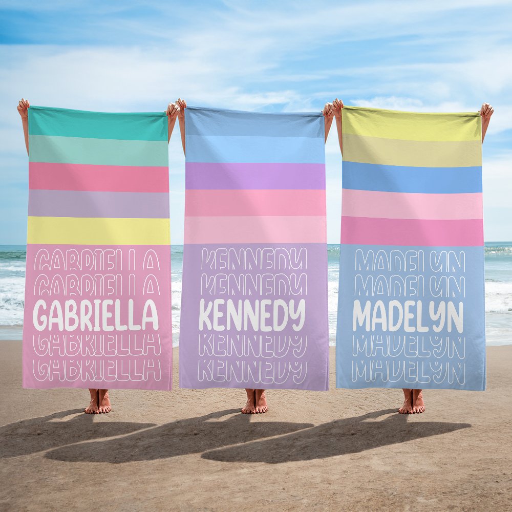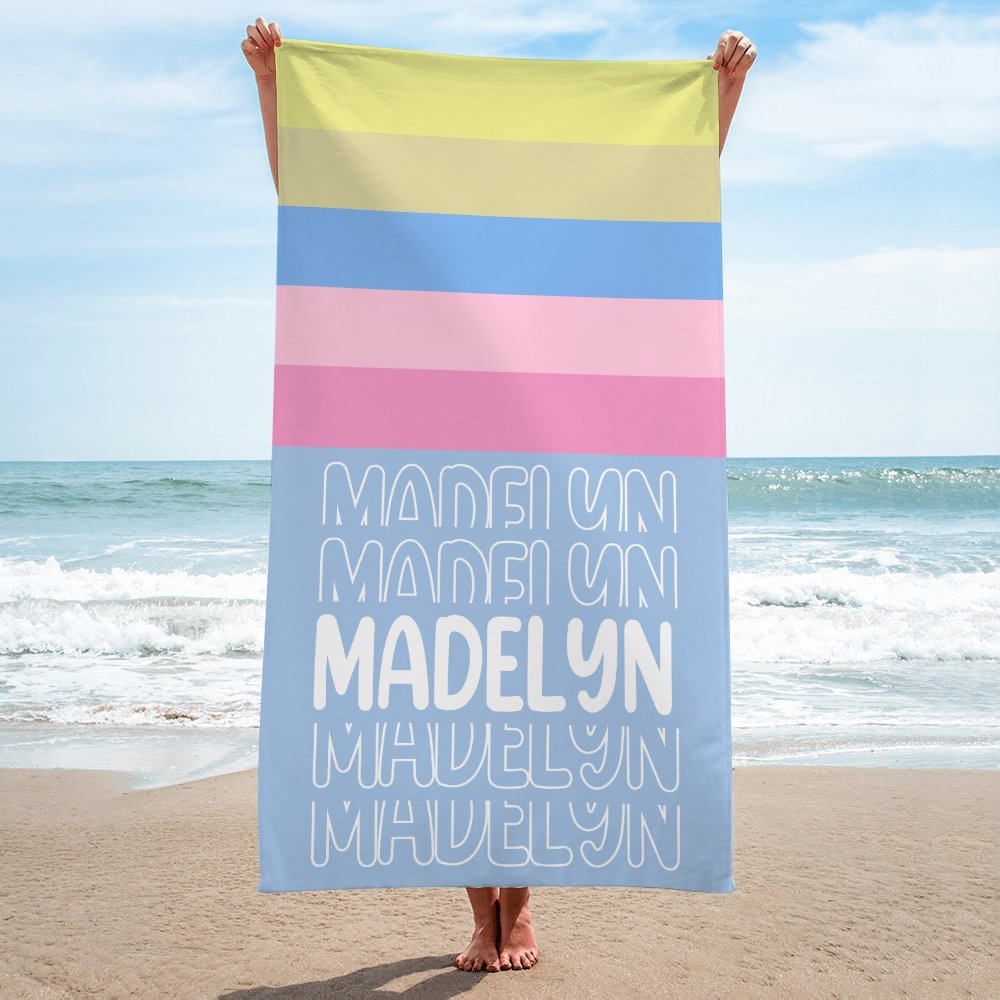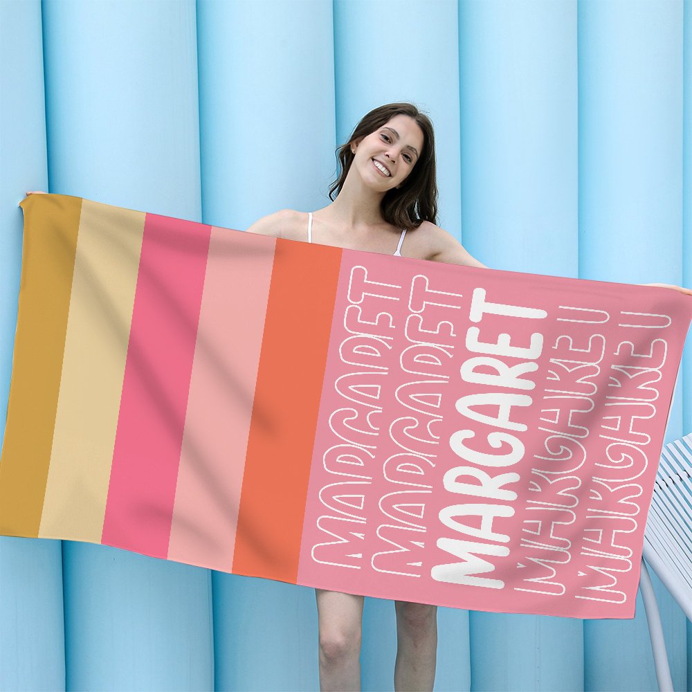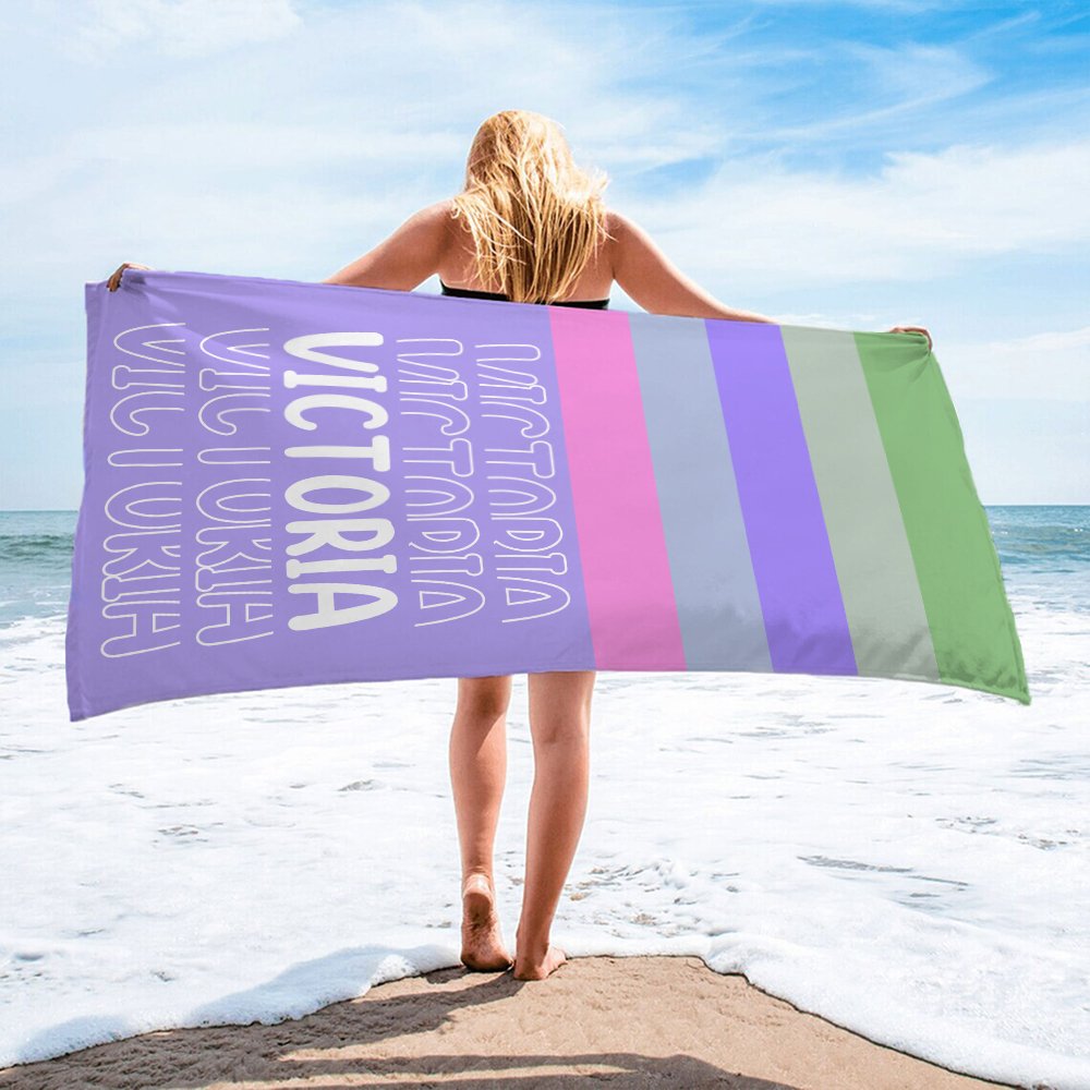 Dieses personalisierte Strandtuch verfügt über ein helles, auffälliges Streifenmuster, das eine erfrischende und energiegeladene Atmosphäre ausstrahlt. Sie können ein bevorzugtes Farbschema auswählen und einen individuellen Namen hinzufügen, so dass jedes Strandtuch ein Unikat ist, das auf Ihre individuellen Vorlieben zugeschnitten ist.