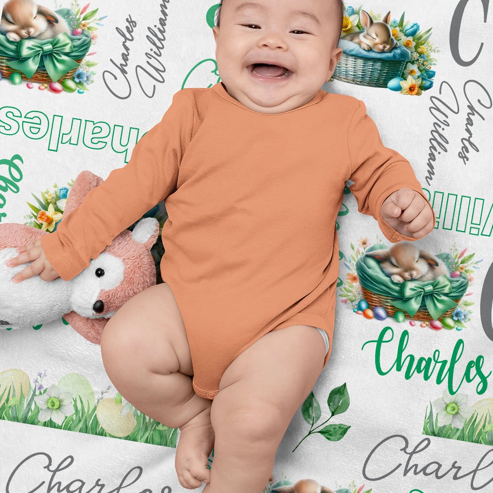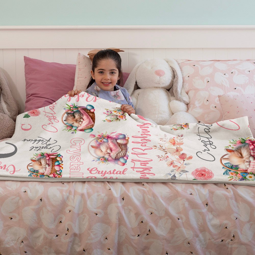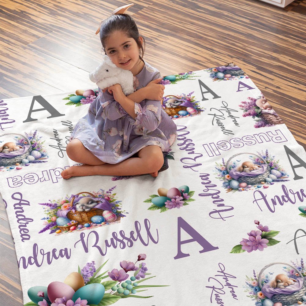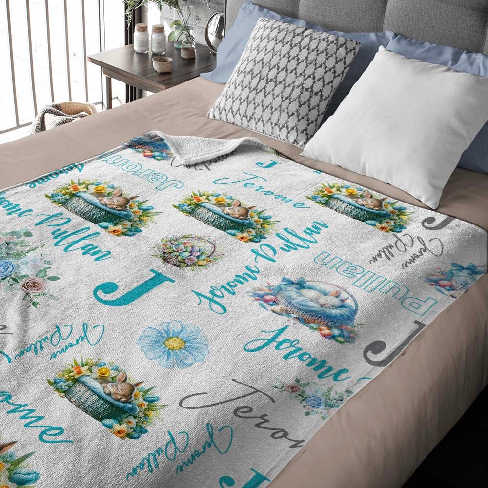 Mit farbenfrohen schlafenden Häschen und kleinen Körbchen als Motiv und niedlichen Namenswolken, Eiern und Blumenmustern ist diese Decke voller Kindlichkeit und Wärme. Sie können den Namen und die Initialen Ihres Kindes in das Design der Decke einarbeiten, um ein einzigartiges Geschenk für Ihr Kind zu kreieren.