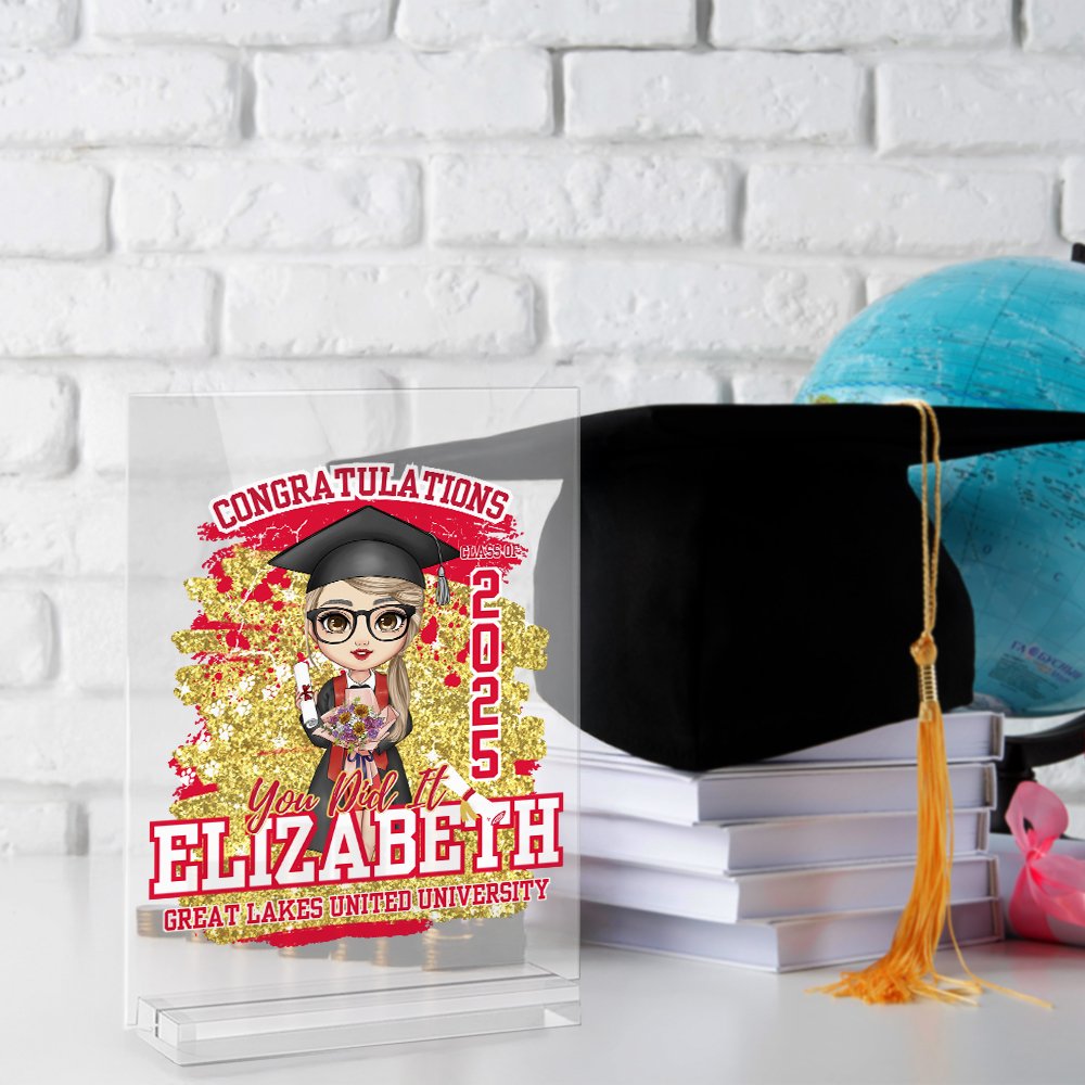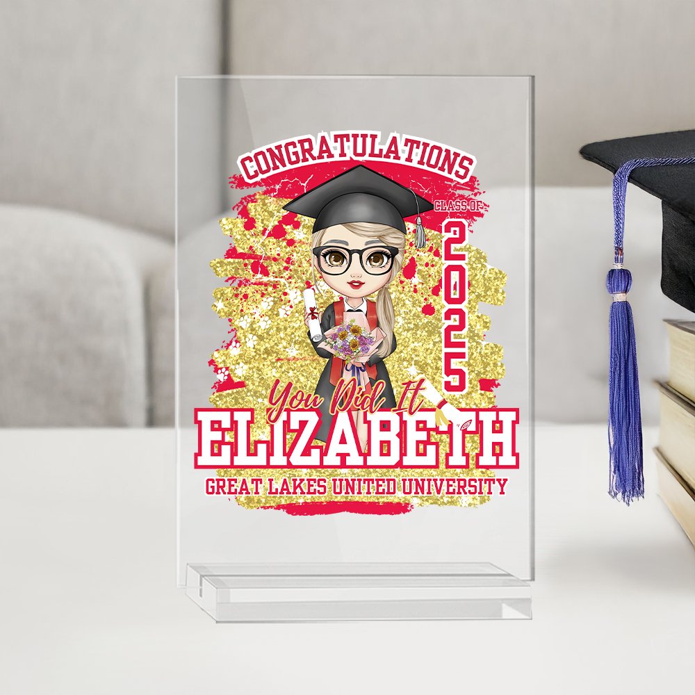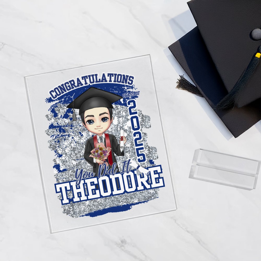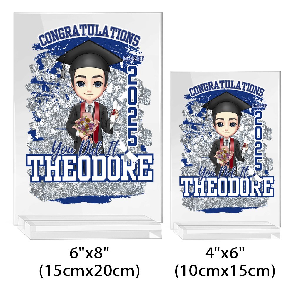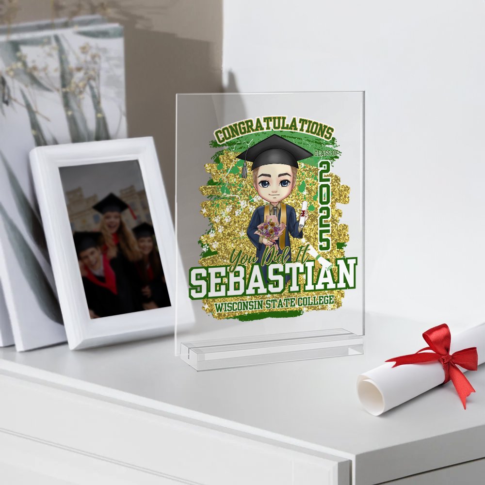 Feiern Sie Ihre Leistungen mit einer personalisierten Acryltafel, die eine Cartoon-Figur zeigt, die Sie repräsentiert! Bedruckt mit Ihrem Namen, dem Jahr Ihres Abschlusses und Ihrer Schule, wird dieses einzigartige Andenken Ihre harte Arbeit und Ihren Erfolg würdigen. Die Plakette enthält außerdem den feierlichen Text "You Did It", der die festliche Stimmung noch verstärkt.