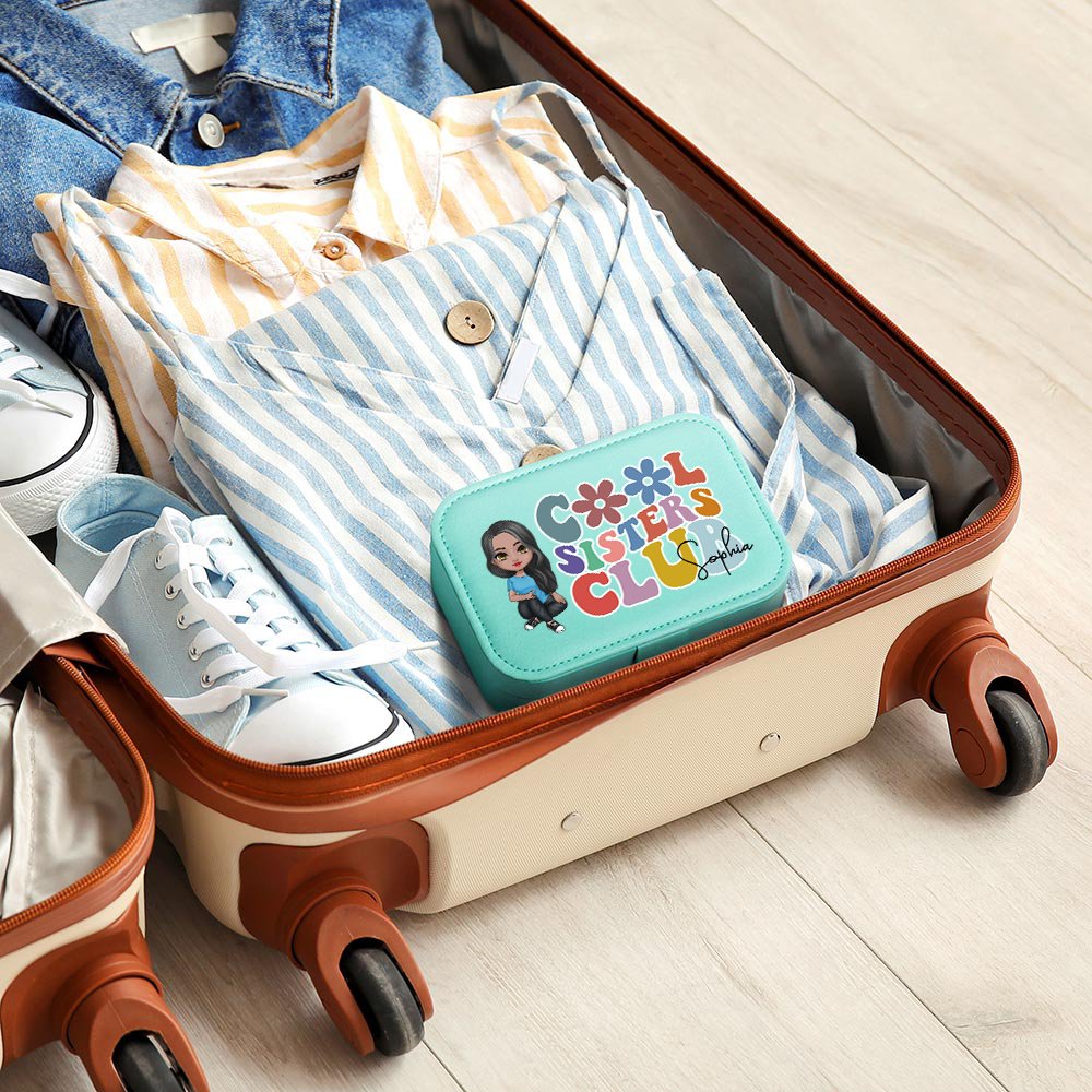 Dieses bezaubernde Schmuckkästchen zeigt entzückende Cartoon-Figuren und einen stilvollen Titel, "Cool Sister Club", der die Individualität feiert. Das Design schafft eine perfekte Balance zwischen Skurrilität und Raffinesse und veranschaulicht die starke Bindung zwischen Schwestern.