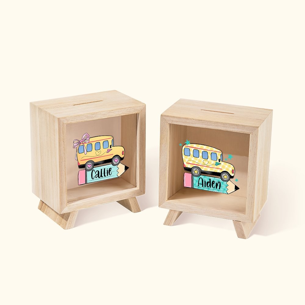 Personalisierte Coquette Bogen Stern Schule Bus Bleistift Design hölzerne Spardose mit Namen zurück zu Schule Geschenk für Kinder