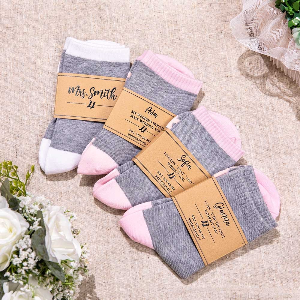 Die Socken können mit Namen auf den Anhängern personalisiert werden, um die Einzigartigkeit des Hochzeitstages zu zeigen.
