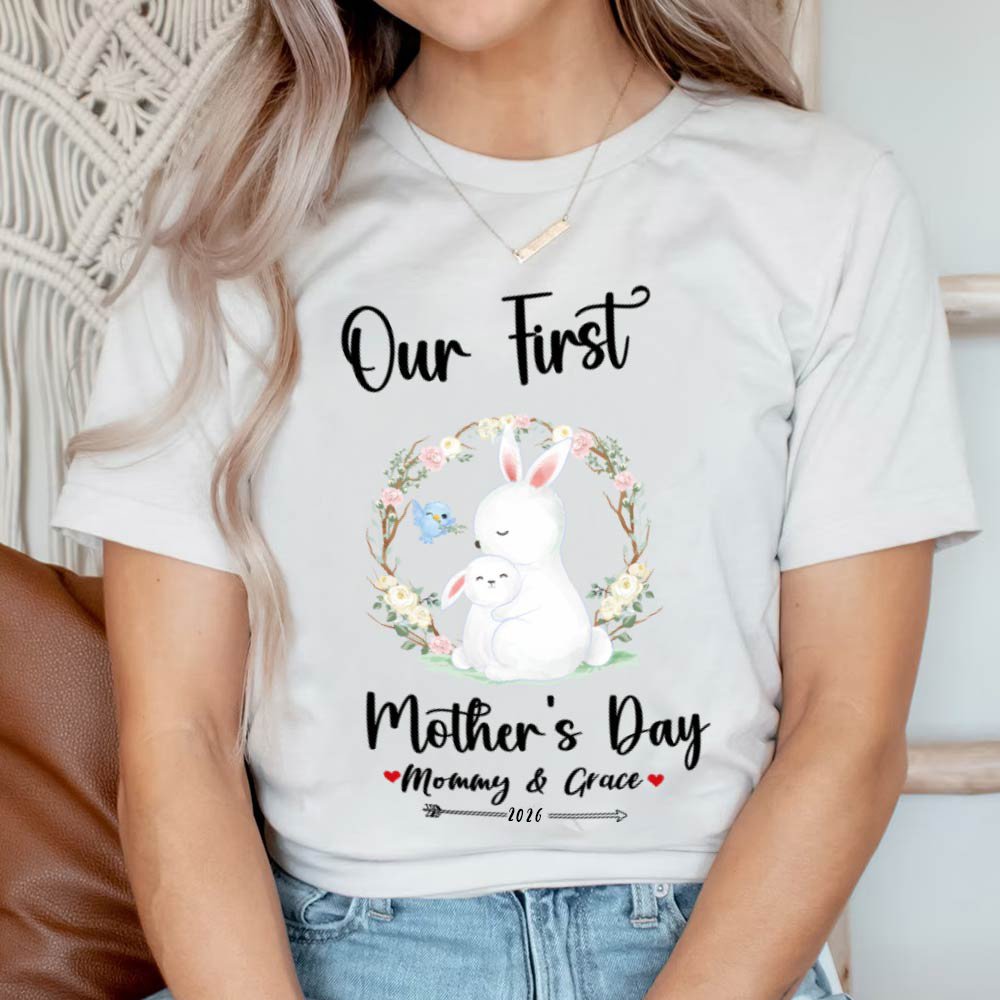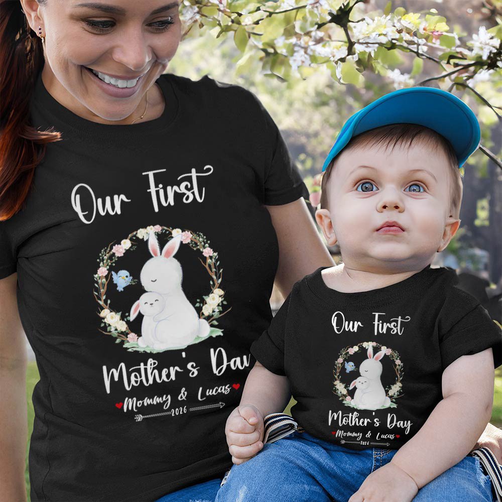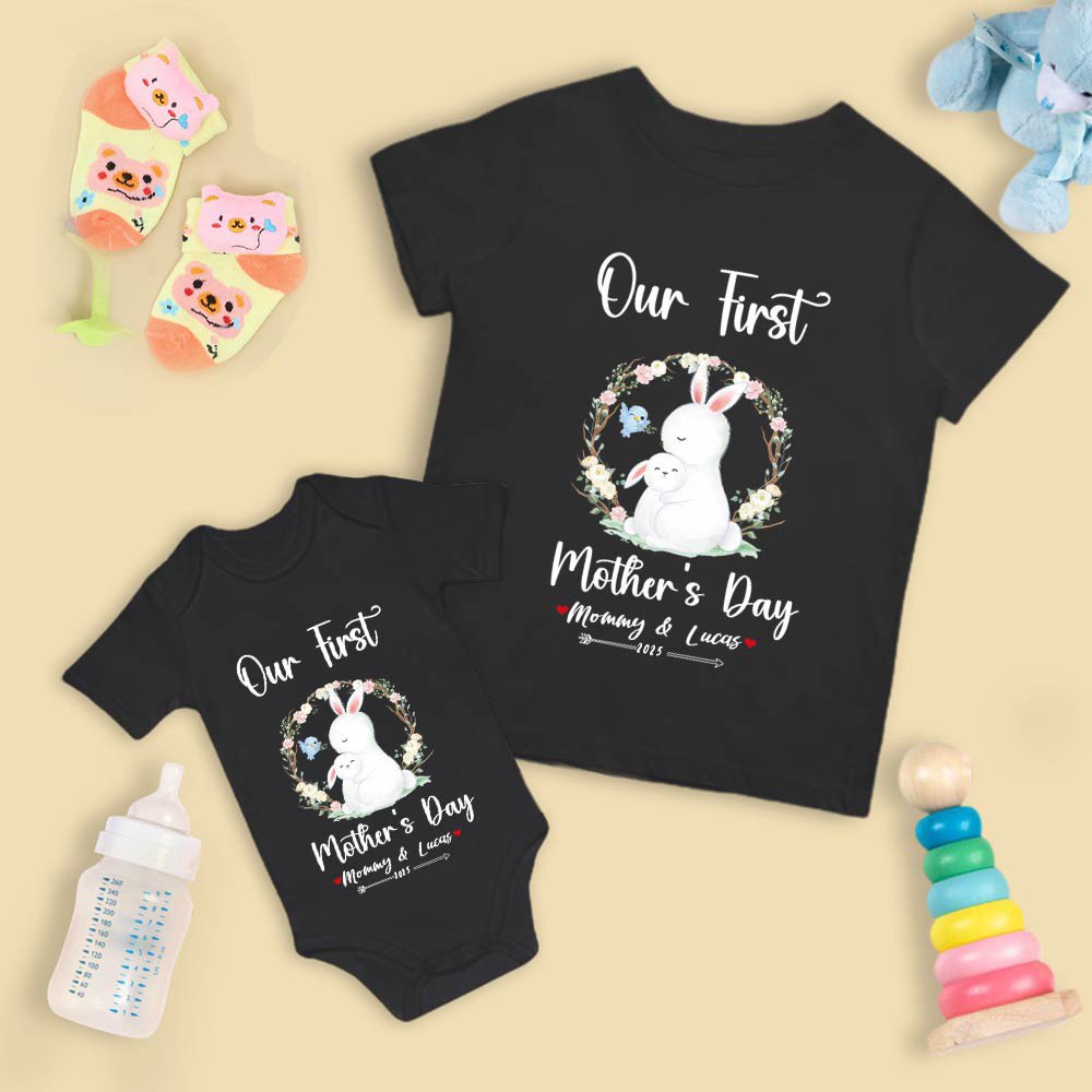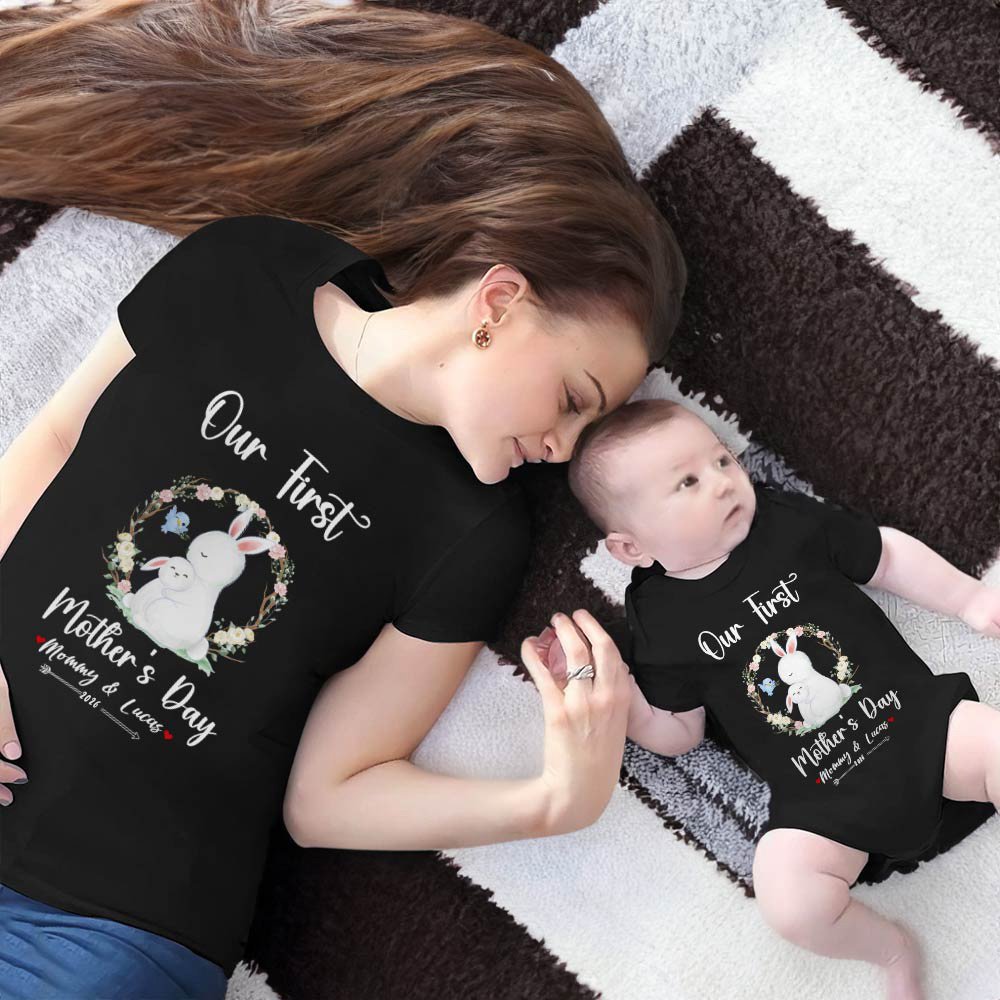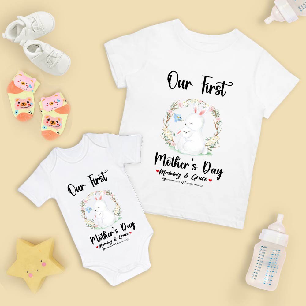 Machen Sie diese erste Muttertag etwas Besonderes mit unseren personalisierten Hase Mama T-Shirt und Baby-Strampler. Niedliche Häschen umgeben von Blumen auf der Kleidung. Sowohl das T-Shirt und Strampler kommen in 3 Farben. Passen Sie diese Kleidung mit Mama und Baby Namen und ein Jahr, um diesen besonderen Tag zu feiern.