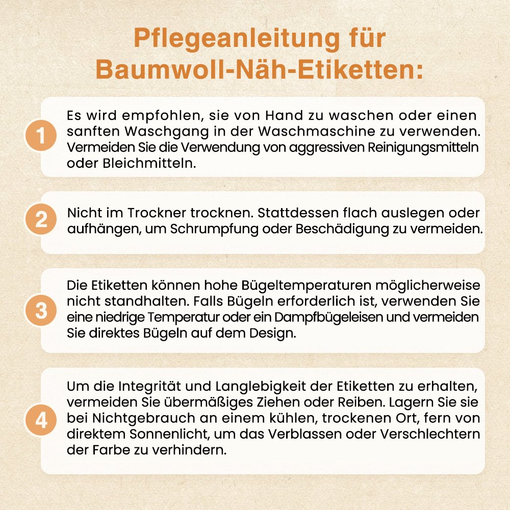 Pflegehinweise: - Es wird empfohlen, das Kleidungsstück von Hand oder im Schonwaschgang der Waschmaschine zu waschen. Verwenden Sie keine scharfen Waschmittel oder Bleichmittel. - Nicht im Trockner trocknen. Legen Sie sie stattdessen flach hin oder hängen Sie sie zum Trocknen auf, damit sie nicht schrumpfen oder beschädigt werden. - Die Etiketten können bei hohen Temperaturen nicht gebügelt werden. Wenn Sie sie bügeln müssen, verwenden Sie ein Bügeleisen mit geringer Hitze oder Dampf und vermeiden Sie es, direkt auf das Design zu bügeln. - Um die Integrität und Langlebigkeit der Etiketten zu erhalten, vermeiden Sie übermäßiges Ziehen oder Reiben. Wenn Sie die Etiketten nicht benutzen, bewahren Sie sie an einem kühlen, trockenen Ort auf, der vor direkter Sonneneinstrahlung geschützt ist, um ein Ausbleichen der Farbe zu verhindern.