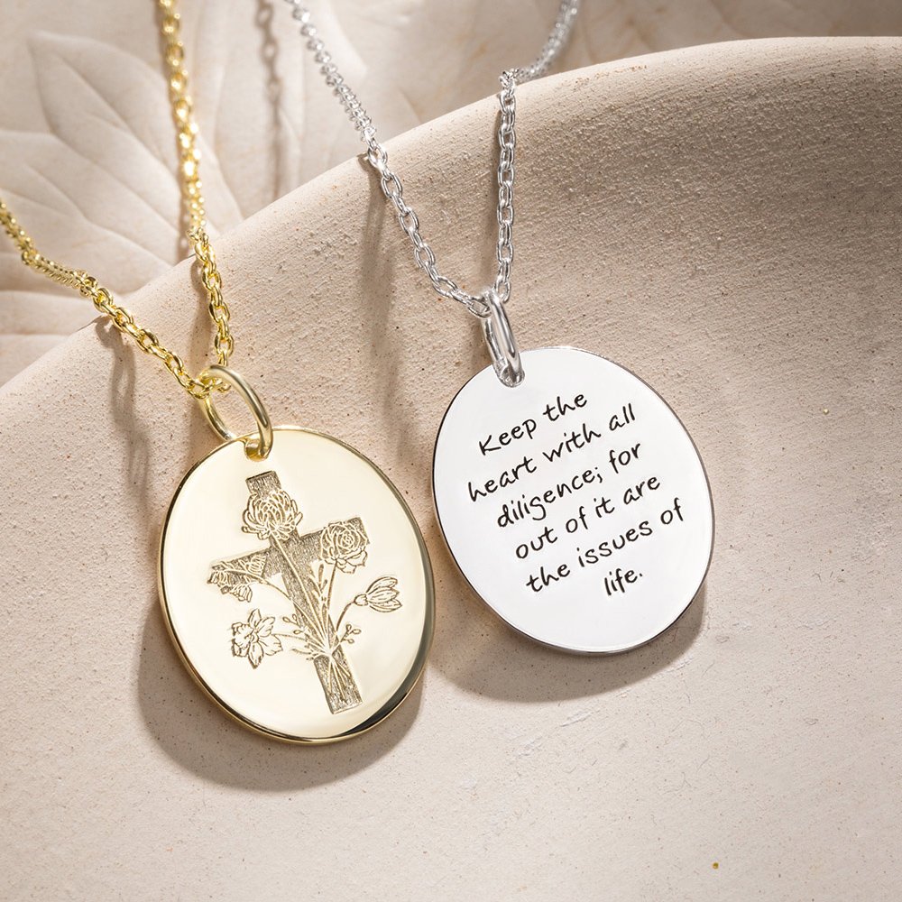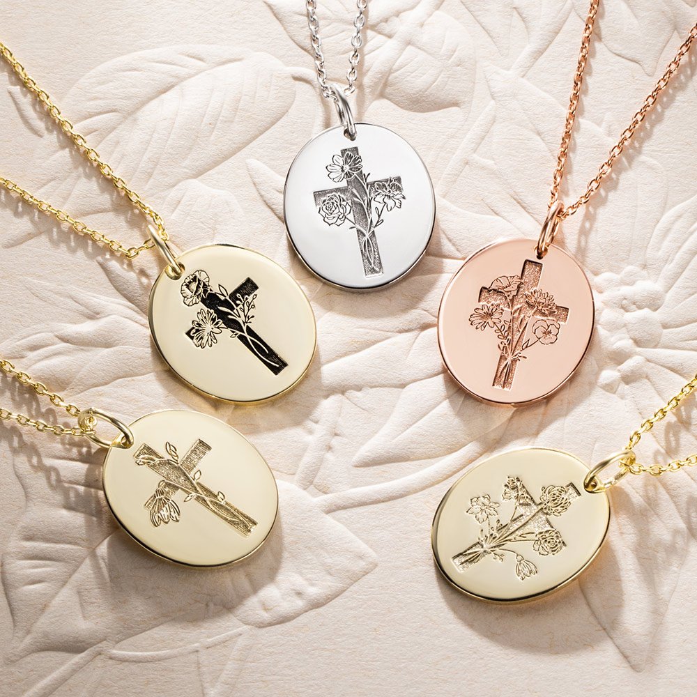 Bringen Sie ihren Glauben und ihre Individualität mit einer personalisierten Halskette mit Kreuz zum Ausdruck. Dieses atemberaubende Stück verfügt über einen Kreuz-Anhänger mit ihrem Namen elegant eingraviert, die Schaffung eines einzigartigen und sinnvolle Accessoire, das ihre Spiritualität widerspiegelt. Personalisierbare Sätze mit Ihrer Lieblingsbibel und mehr zum Mitnehmen!
