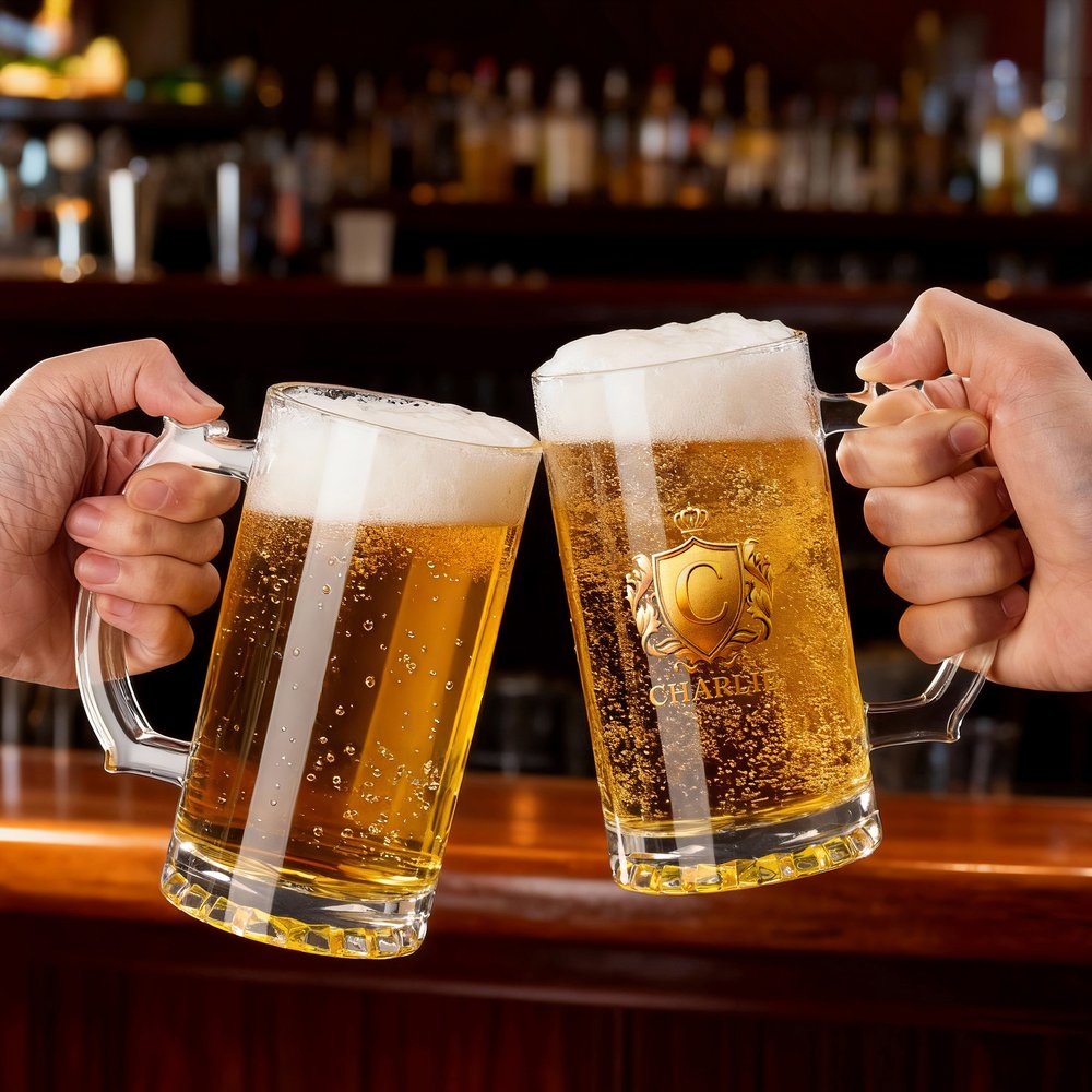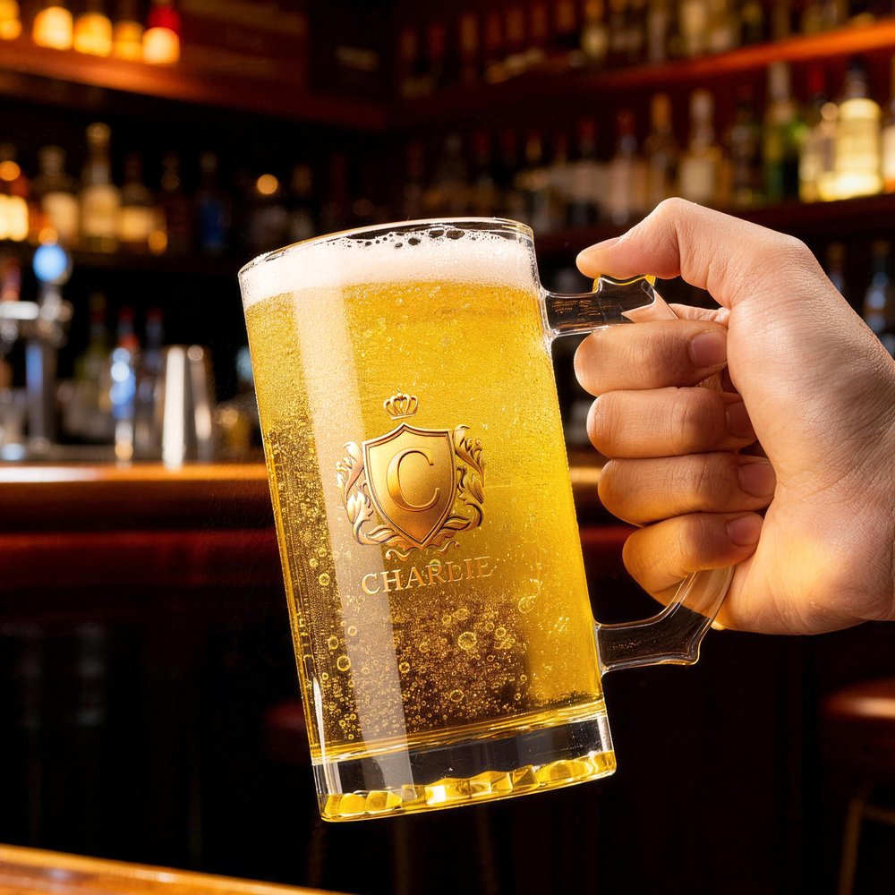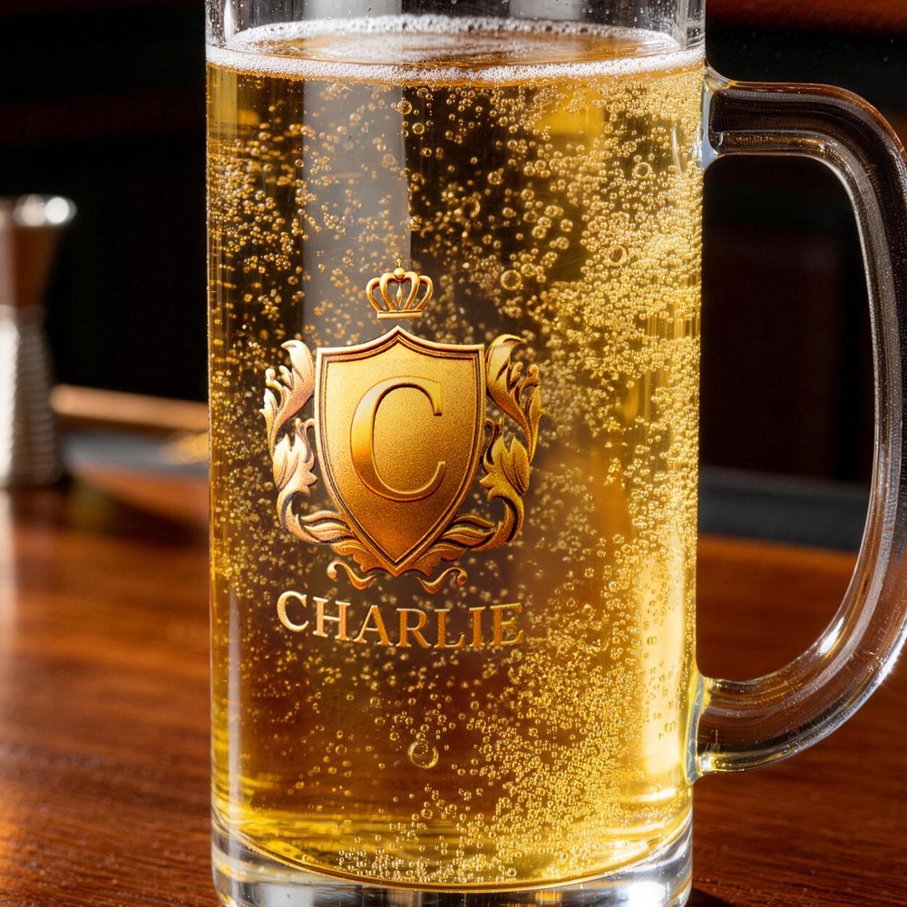 Dieses Bierglas zeigt ein goldenes Abzeichenmuster gepaart mit Kronen-Elementen, die eine retro-elegante Ästhetik schaffen. Es kann mit einer Initiale und einem Namen personalisiert werden, so dass individuelle Identität und aristokratischer Stil nahtlos ineinander übergehen. Es ist mehr als nur ein funktionales Trinkgefäß, sondern ein unverwechselbares Symbol des persönlichen Geschmacks, das jedem Trinkspruch einen Hauch von Exklusivität und wertvoller Erinnerung verleiht.