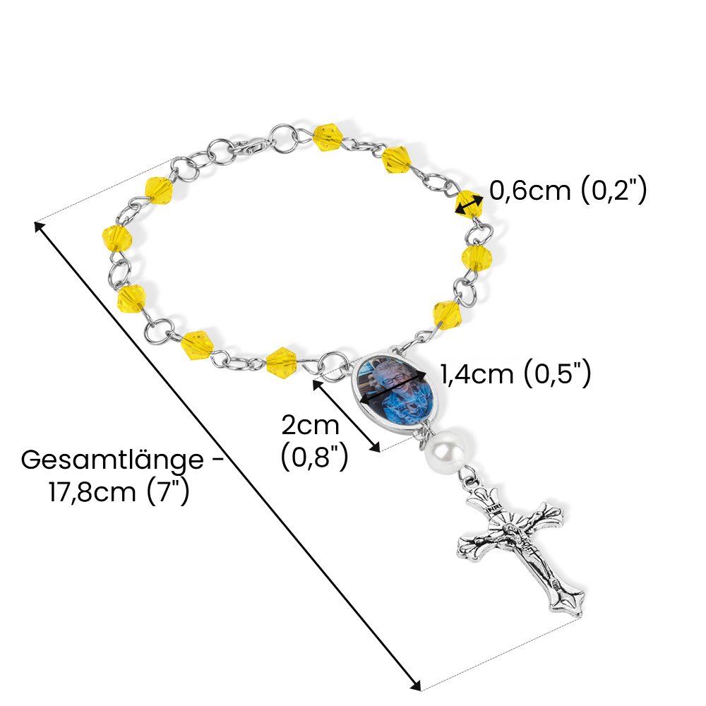 Dieses atemberaubende Stück verbindet zeitlose religiöse Symbolik mit einem Hauch von Geburtstags-Elementen und individueller Gestaltung. Mit viel Liebe zum Detail gefertigt, verfügt jedes Armband über Bicone Geburtssteine, die die strahlenden Farben Ihrer Kette einfangen und ein faszinierendes und sehr persönliches Accessoire schaffen.