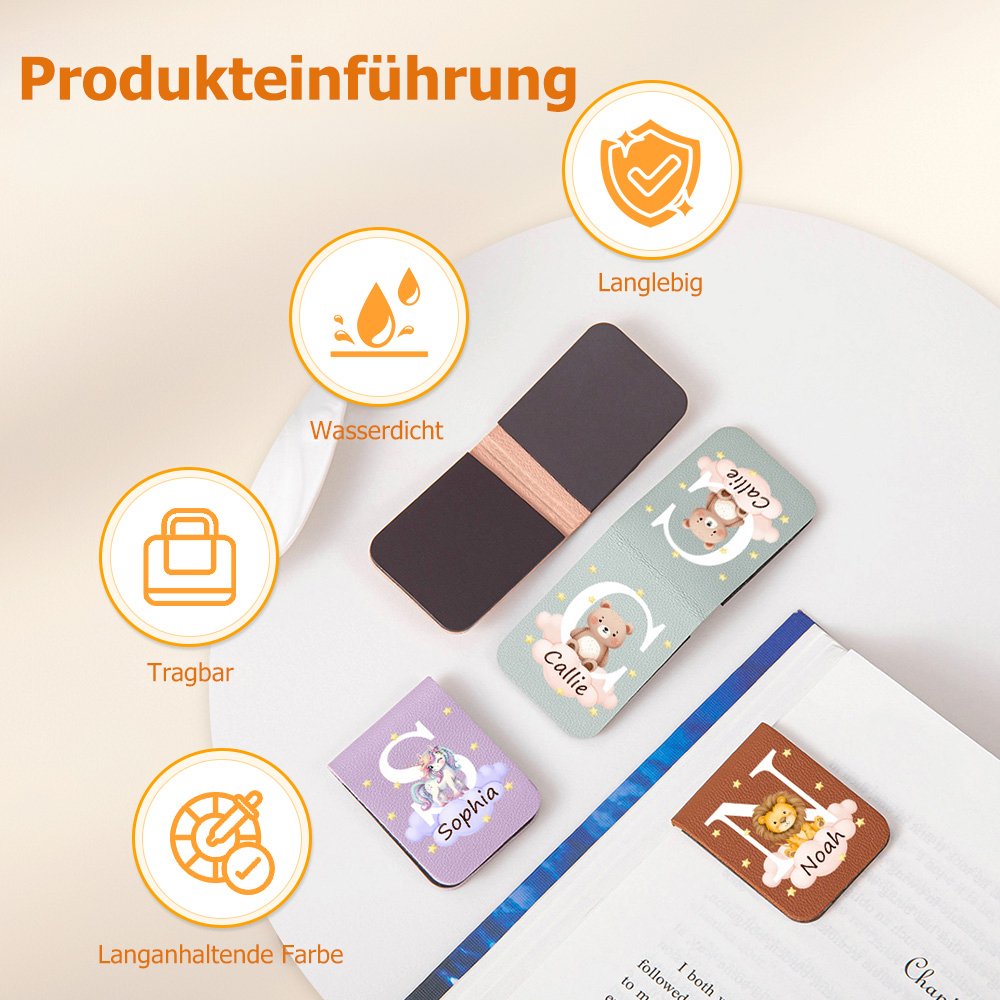 Jedes Lesezeichen präsentiert ein niedliches Cartoon-Tier, das auf einer Wolke sitzt, ergänzt durch einen Namen und einen markanten Anfangsbuchstaben. Sterne im Hintergrund verleihen dem Gesamtbild eine verspielte und lebendige Atmosphäre. Der Stil kombiniert den behaglichen Charme von Leder mit lebendiger Cartoon-Kunst – freundlich, farbenfroh und kindgerecht, dabei jedoch elegant und hochwertig gestaltet.
