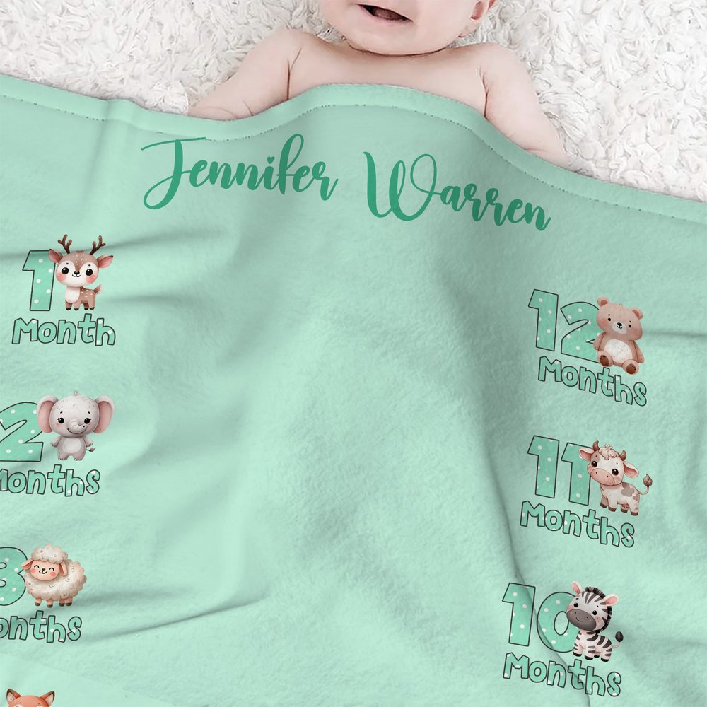 Halten Sie jeden kostbaren Moment mit dieser Decke fest, die das Tier des Monats zeigt, mit 12 Tieren, darunter Elefant, Fuchs, Tiger und Löwe, die eine warme Atmosphäre schaffen, und die auch mit dem Namen Ihres Kindes bedruckt werden kann, was sie zu einem einzigartigen Modeartikel macht.