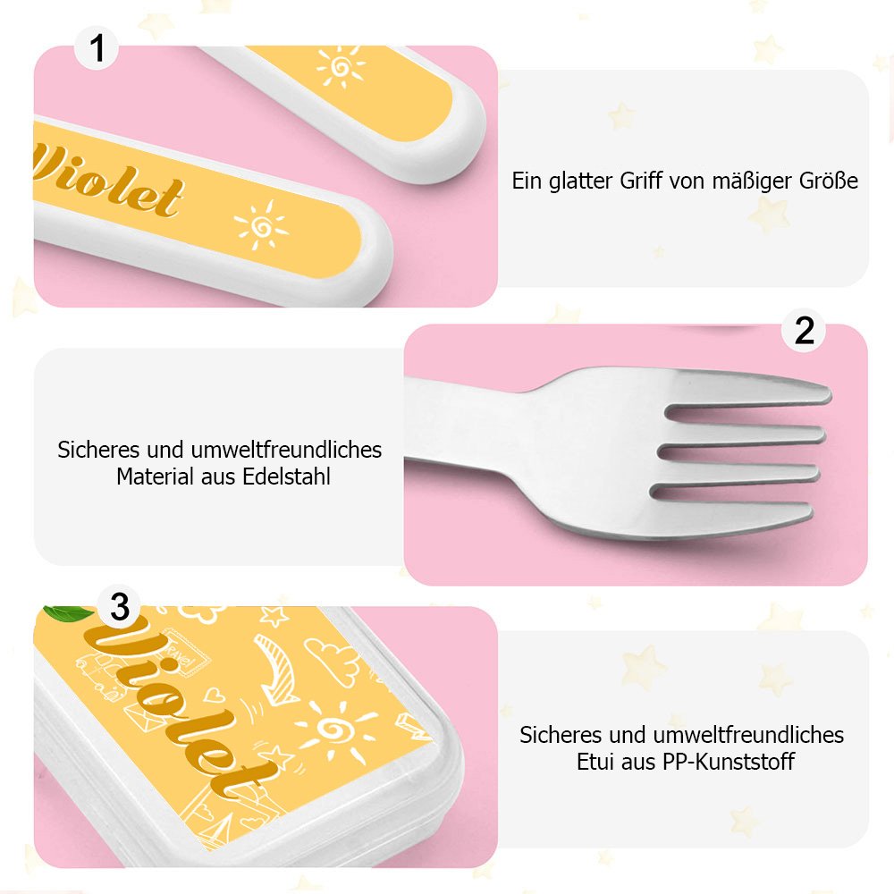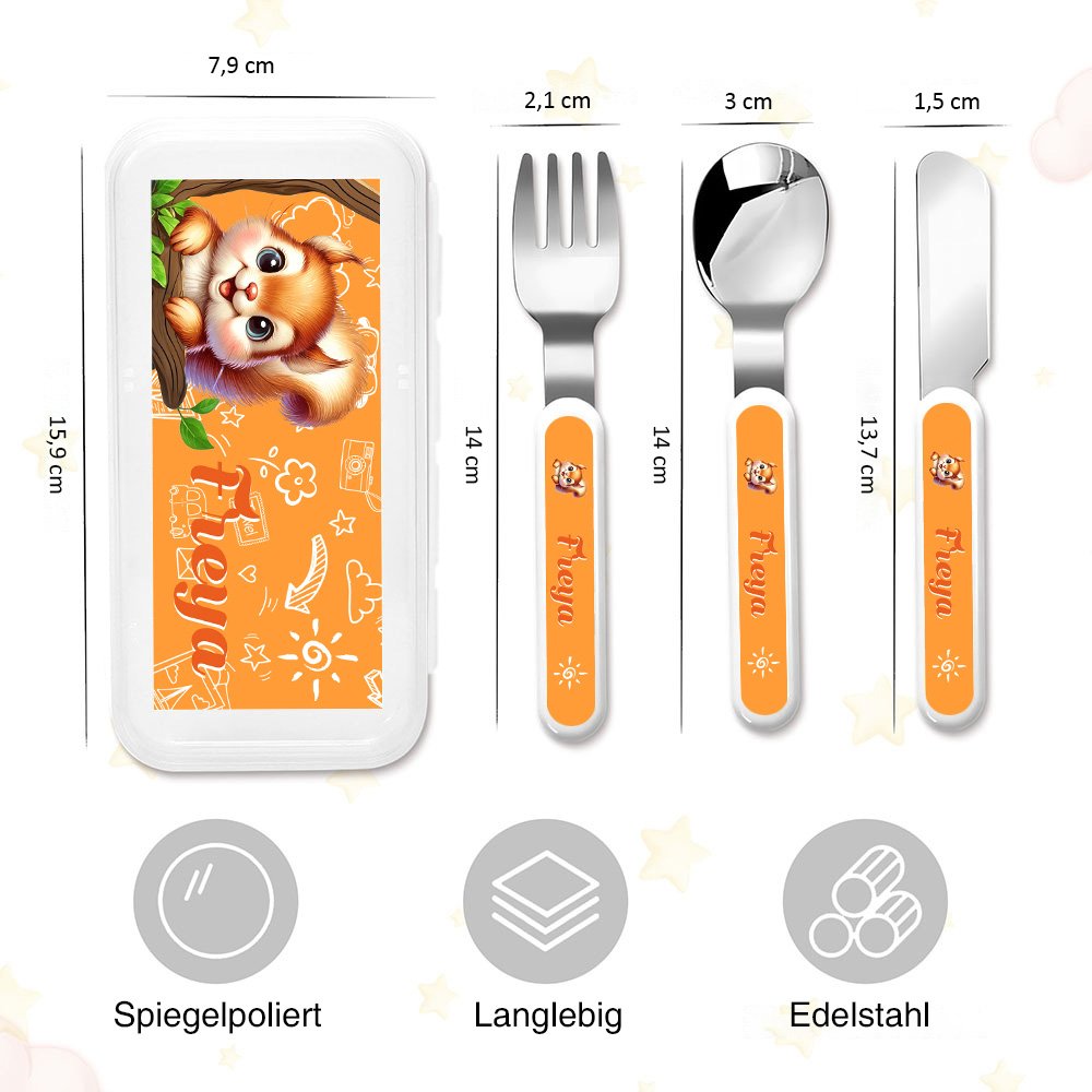 Dieses Kinderbesteck-Set bietet 43 verschiedene niedliche Cartoon-Tiermotive, darunter Einhörner, Waschbären, Zebras, Löwen und viele weitere. So können Sie das Tier auswählen, das am besten den Vorlieben Ihres Kindes entspricht. Das Set sowie das Etui sind in neun attraktiven Hintergrundfarben erhältlich und können mit einem Namen personalisiert werden – für noch mehr Freude und Fantasie beim Essen.
